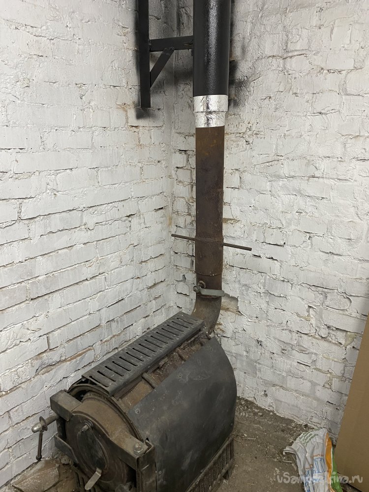 Её я и сейчас решил использовать. Диаметр этой трубы - 110 мм. А диаметр моего дымохода - 130! То есть, эту трубу можно вставить в дымоход, поднять максимально вверх, поставить печку на своё место и опустить трубу, одев её на выходное колено печки.