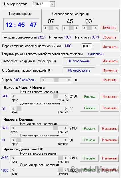 >>> дневную/ночную яркость отдельно для сегментов часы, минуты, секунды и мигающего двоеточия.