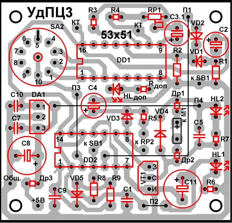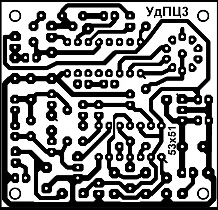 ПП (печатная плата) (см. рисунки 02 и 03) выполнена из односторонне фольгированного стеклотекстолита размерами 53 х 51 х 2 мм. Диаметр отверстий на плате под микросхемы 0,7 … 0,8 мм, под радиоэлектронные компоненты – 0,8 … 0,9 мм, под соединительные проводники - 1…1,2 мм., под крепёжные винты – 3,0 … 3,2 мм.