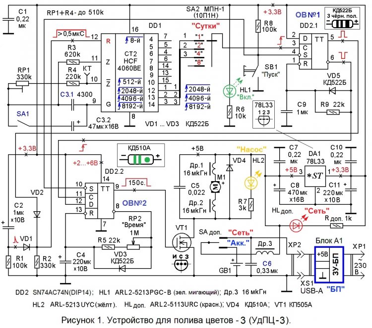 - ОВ №2, собранного на элементах C4 R5 RP2 VD3 DD2.2 и вырабатывающего выходной импульс с регулируемой длительностью, то есть выполняющего функцию таймера, устанавливающего время работы насоса М1;