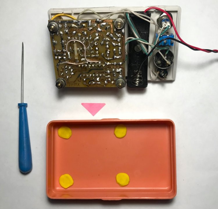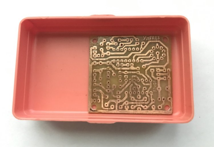 После изготовления ПП был проведён выбор корпуса под размеры заранее изготовленной платы. Подошла стандартная мыльница с размерами 100 х 60 х 25 мм., не менее. Расположение деталей в корпусе получится довольно плотным (не для начинающих радиолюбителей).