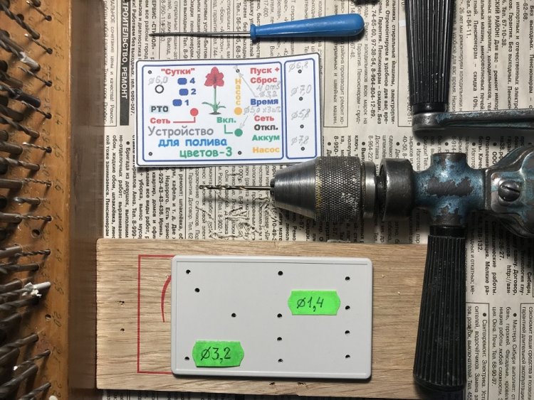 Вместо чертежа передней панели УдПЦ3 разработана и распечатана фальшпанель, на которой карандашом были подписаны диаметры отверстий. Разметку центров отверстий предлагается сделать методом трафарета. В качестве трафарета использована, распечатанная на принтере и наложенная на переднюю стенку корпуса, фальшпанель.