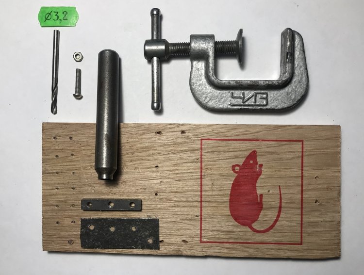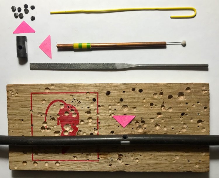 Полая медная трубка (D = 4 мм, d = 3 мм), протыкающая шланг, забивается мелкими цилиндриками шланговой резины. Чтобы подготовить трубку к проделыванию последующих отверстий в шланге, следует освободить медную трубку от забившихся в неё цилиндриков. Сделать это можно с помощью распрямлённой канцелярской скрепки (на рисунке 23 она показана сверху). В правый конец полой медной трубки вставлена булавка с белой круглой пластмассовой головкой. Она нужна для того, чтобы при проделывании отверстий в шланге, не повредить кожу на ладони!!! Плоский надфиль может понадобиться при затачивании округлых режущих плоскостей трубки.