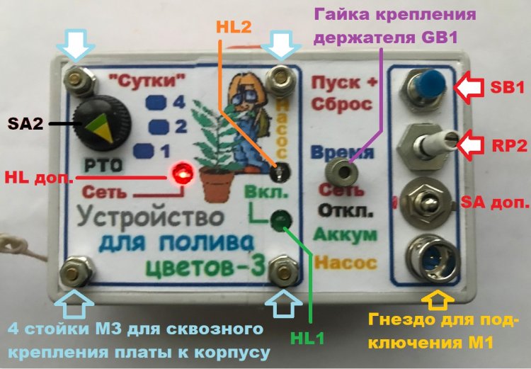 - малогабаритного переключателя SA2 «Сутки», обеспечивающего автоматическое включение полива каждые первые, вторые или четвёртые сутки.