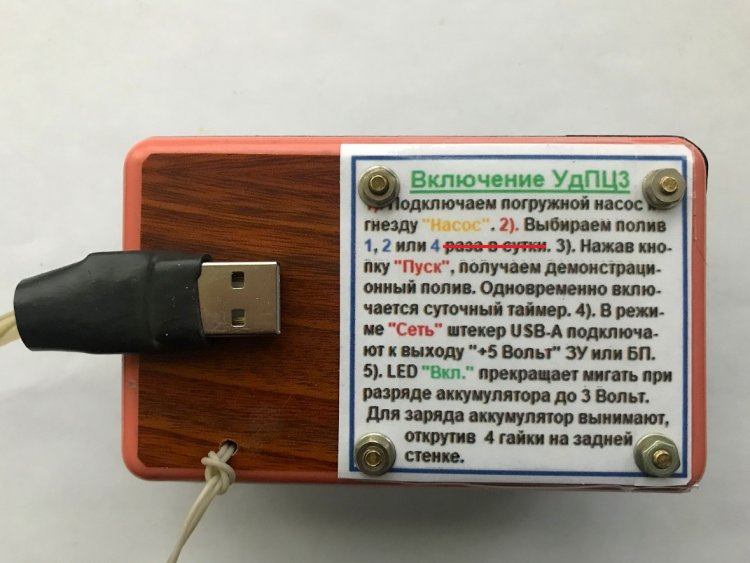 Вид на УдПЦ3 со стороны задней стенки корпуса. В последней версии этикетки - инструкции исправлена ошибка. На конце двухпроводного кабеля питания припаян на половину самодельный штекер типа USB-A для подключения к выходному гнезду ЗУ-БП.