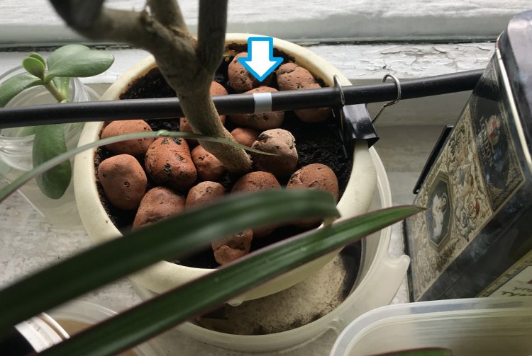 Голубая стрелка указывает на место расположения одного из отверстий для полива на чёрном поливочном шланге. Шланг на цветочном горшке поддерживается канцелярским «зажимом для бумаг» фирмы «STAFF» длиной 41 мм (артикул 224609). Такие зажимы установлены на каждом из 10 (автоматически поливаемых цветочных) горшков.