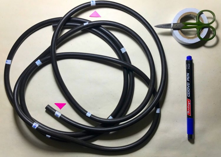 Универсальный поливочный шланг рассчитан на одновременный полив 10 горшков с цветами и имеет 10 помеченных изолентой отверстий для вытекания воды. Отверстия ориентируются вниз (в сторону земли). Если случайно шланг оказался проткнут насквозь, то второе (лишнее) отверстие легко заклеить даже полувитком липкой изоленты.