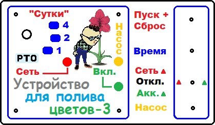 Вид спереди на УдПЦ3. Свечение красного LED HL доп. «Сеть» указывает на работу «поливатора» через ЗУ-БП от сети ~230 Вольт (а не от аккумулятора GB1). Зелёный светодиод «Вкл» является мигающим, и постоянно ни в каких режимах не светится. Просто для наглядности фотоаппаратом (в режиме «мультикадр») выловлен момент импульсного зажигания светодиода.