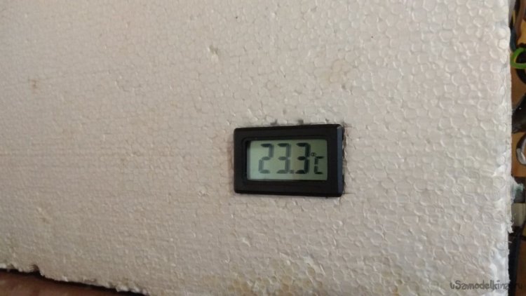 Когда у термометра был внешний датчик с проводом, я цеплял термометр проводом за пластик. В отсутствии провода необходимо было придумать, как крепить термометр. К задней стенке датчика был приклеен на суперклей кусок пластика. Просто и сердито.