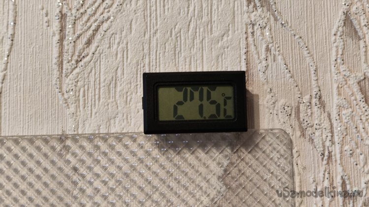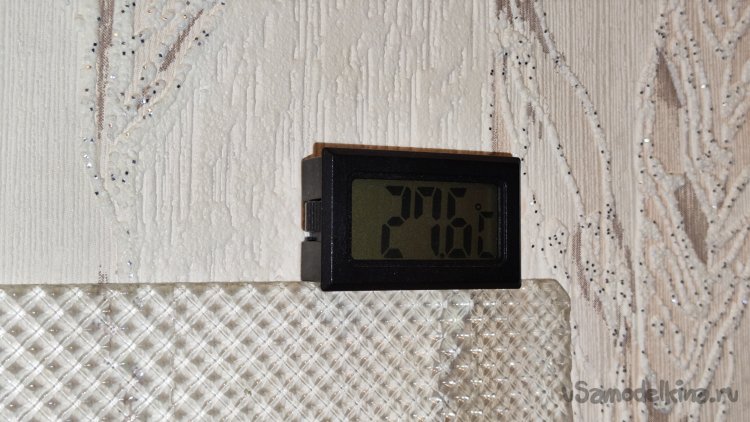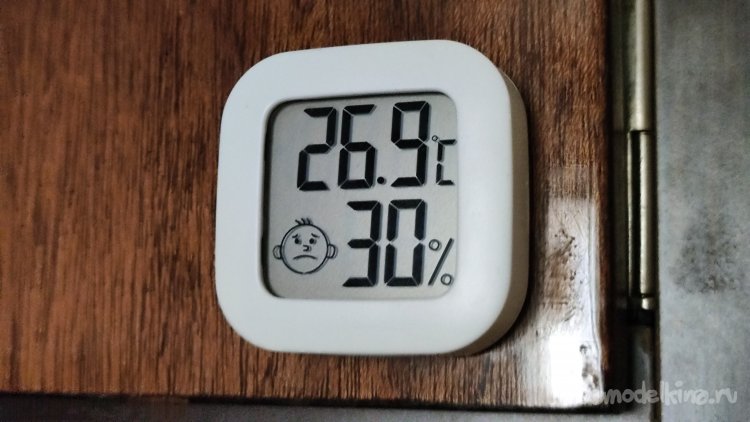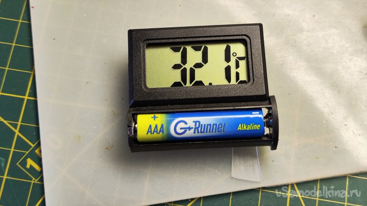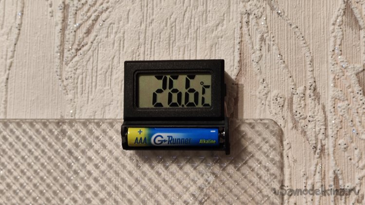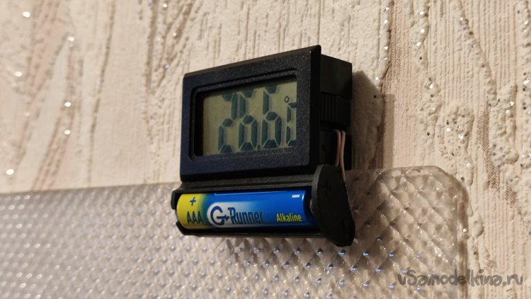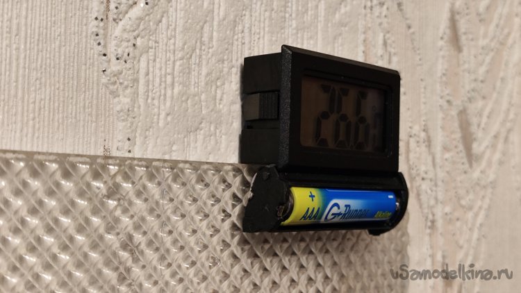 Устанавливаю новую батарейку ААА. Корпус немного нагрелся от тепла рук, поэтому и температуру термометр показывает больше, чем есть в помещении. Поставлю на место, остынет и все будет правильно.