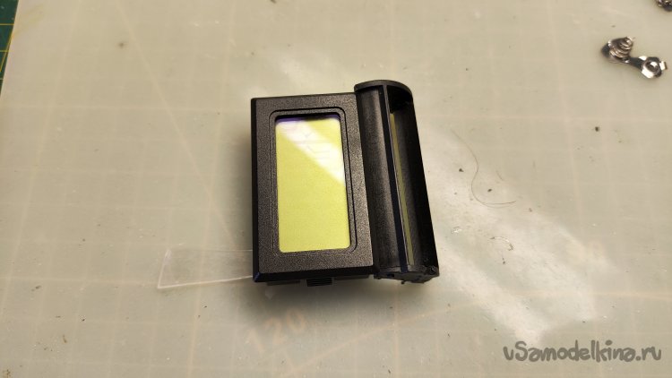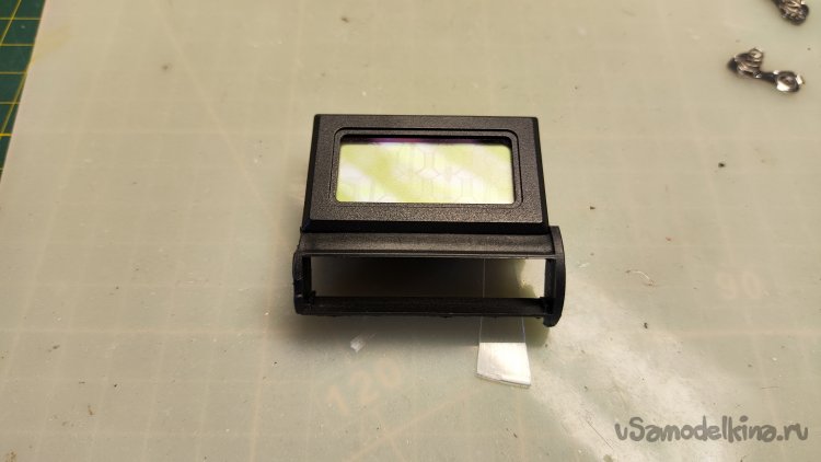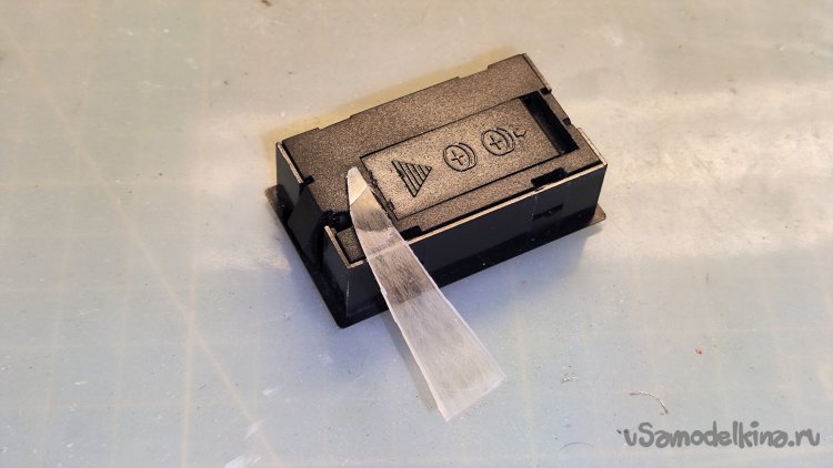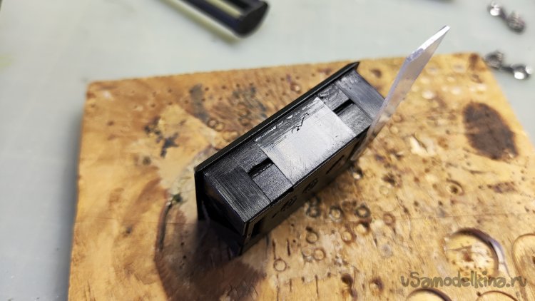 Для приклеивания блока к корпусу термометра необходимо сделать хорошее прилегание деталей. Обрезаю ножом лишнее, стараясь сделать нужный угол среза. Подрезаю так же вторую сторону.
