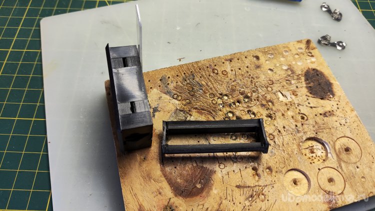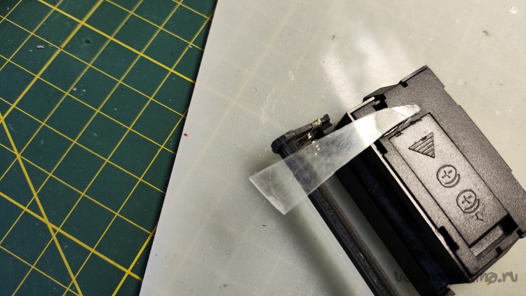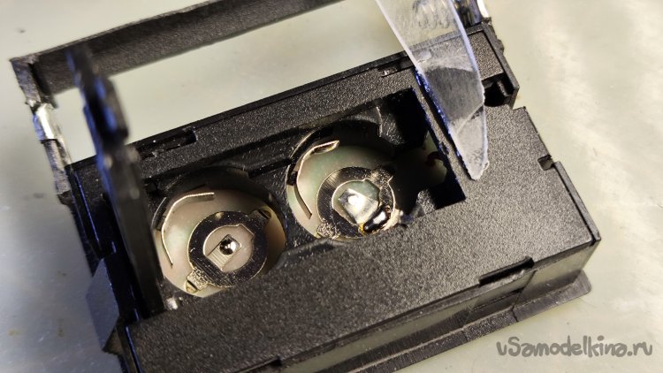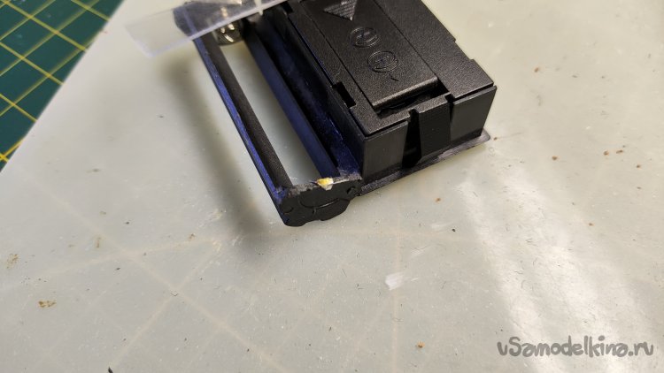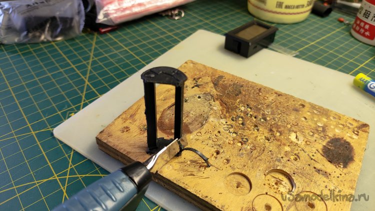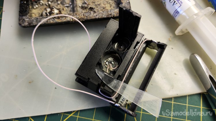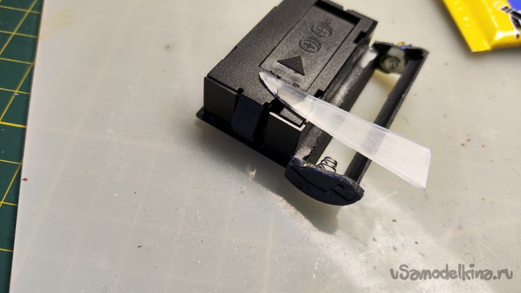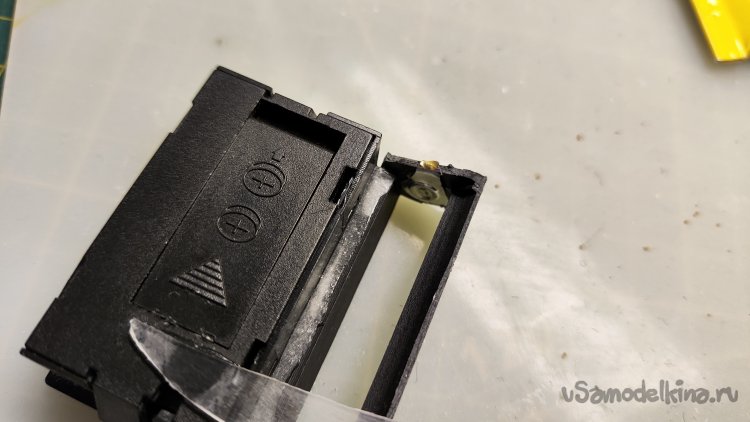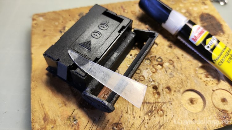 Детали склеились. Обрезаю до необходимого мне профиля контакты, устанавливаю их в держатель на клей. На место пайки нанес флюс для лужения контактов.