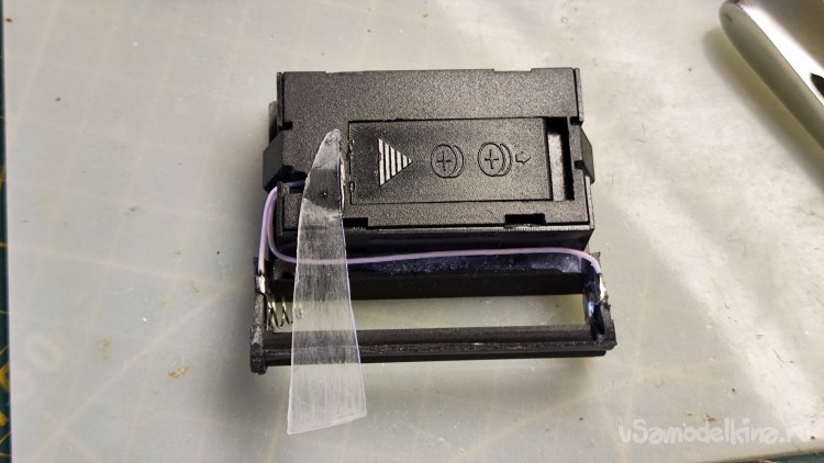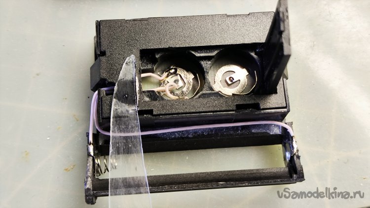 Первыми соединяю плюсовые контакты, завожу провод через имеющееся отверстие в корпусе. Провод натягиваю закручиванием. Была мысль приклеить провод в месте прохождения вдоль корпуса, но провод держится достаточно жестко и приклеивание в принципе не требуется.