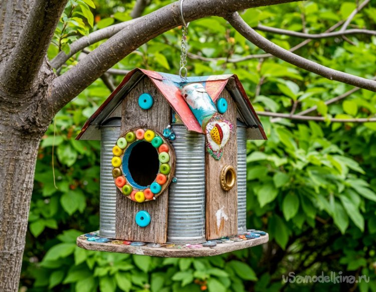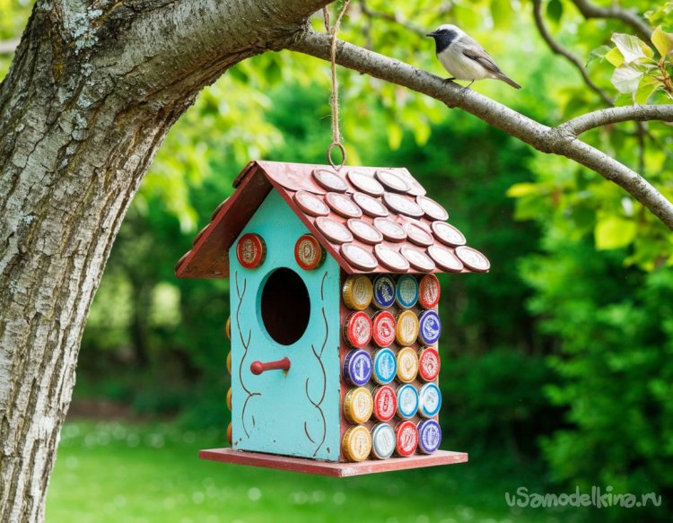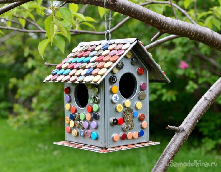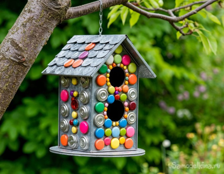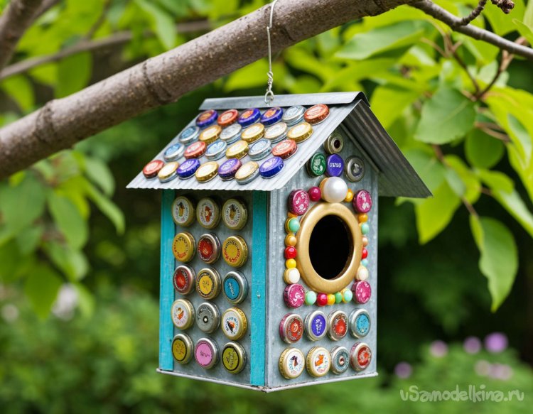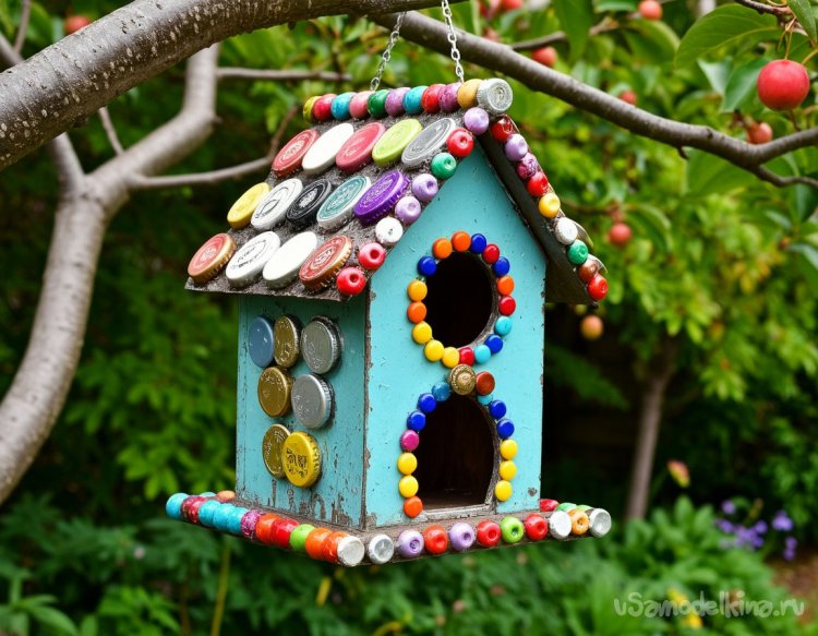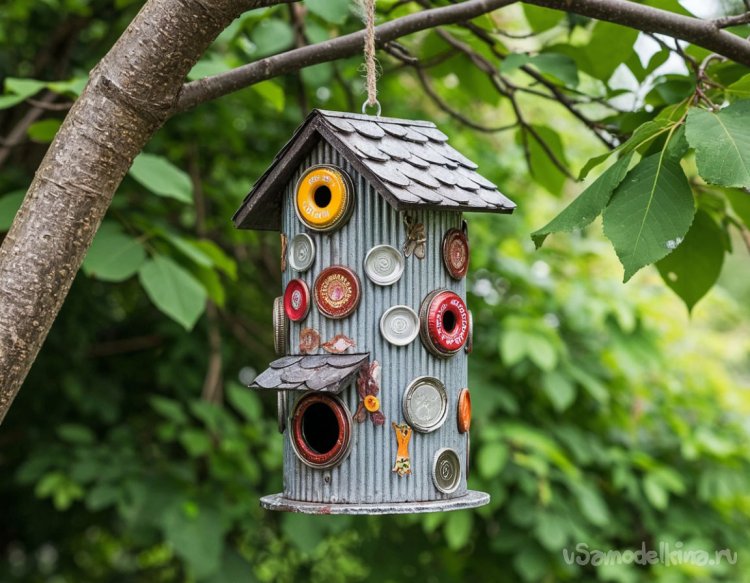 Причудливый и сказочный самодельный скворечник, сделанный из переработанных материалов, таких как жестяные банки, крышки от бутылок и разноцветные бусины