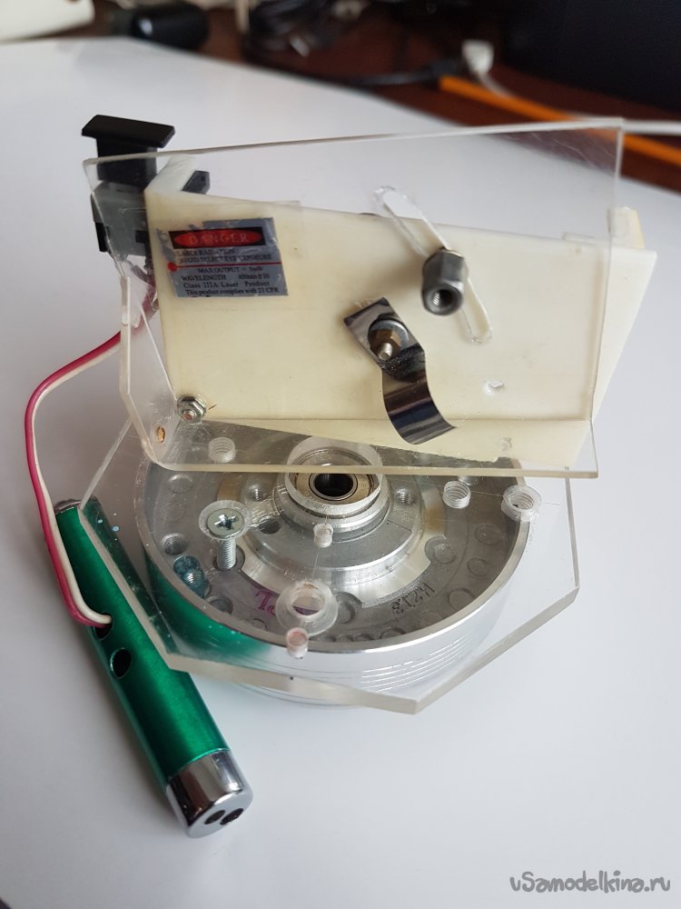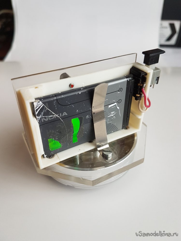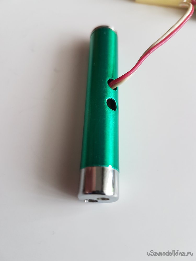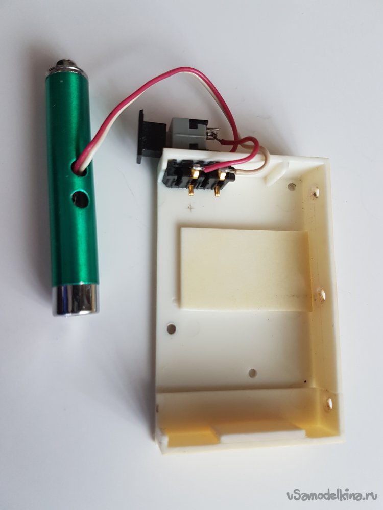Здесь ,кроме указки, устанавливается выключатель питания лазера и аккумулятор. Причем есть возможность изменять угол положения указки по горизонту от 0 до ,примерно, 30°. Аккумулятор подключается через контактную колодку от мобильника. А в указке удалена кнопка включения и внешнее питание подводится по проводу. Больше в ней ничего не изменял.