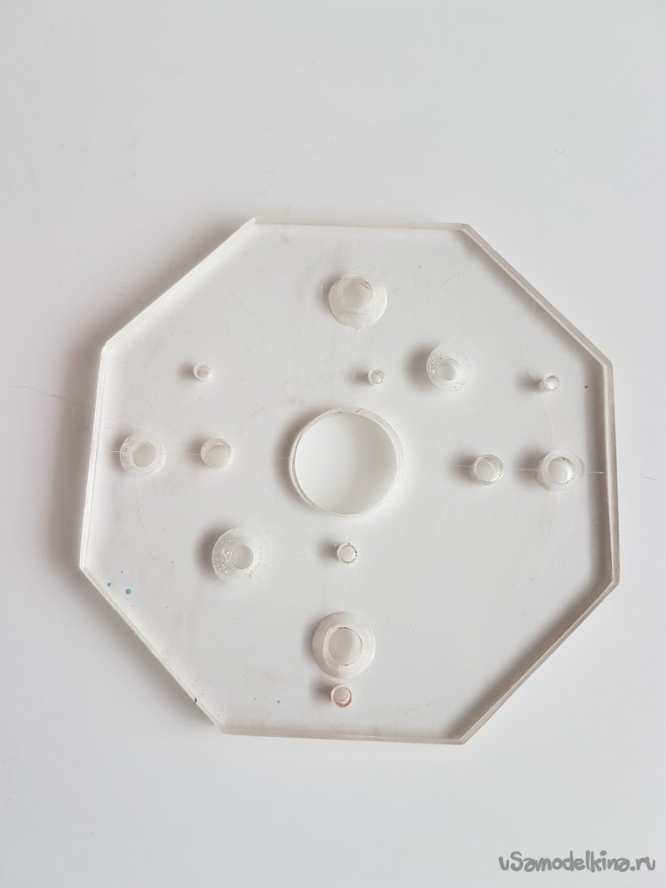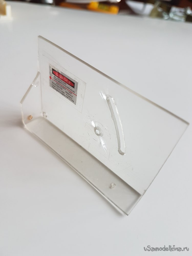 . Первоначально использовалась лазерная указка , где в комплекте были насадки для формирования точки и разных символов и фигур. От нее отказался. Поставил указку обычную, без насадок и ,как оказалось, более удачную в монтаже и работе. Для крепления указки, аккумулятора и уровня, из куска 4мм оргстекла (можно взять любую пластмассу) изготовил плату-монтажку, которую закрепил на блоке видеоголовок (верхней, вращающейся части) винтами.