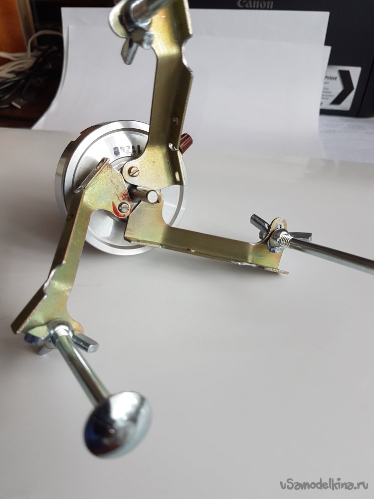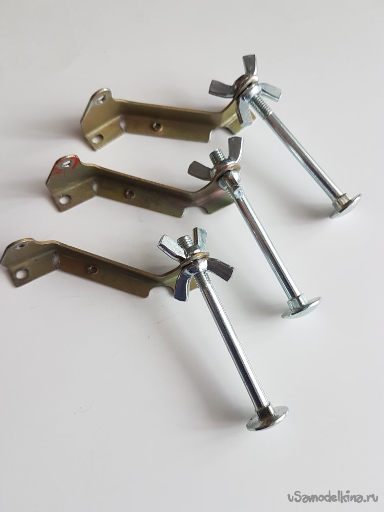 Снизу к корпусу узла видеоголовок крепятся три стойки из уголков. Я использовал для этого уголки крепления платы от магнитофона «Весна 202»(из закромов). Распилил, согнул и как раз подошли. Причем отверстия с резьбой на корпусе узла(что не будет вращаться) уже есть, заводские. А вот в качестве регулируемых стоек применил мебельные болты 6х70 мм.