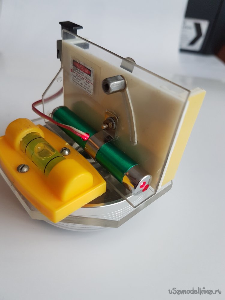 Настраивать уровень и работать с ним просто. Крепим уголки к нижней части узла головок. Устанавливаем на ровную поверхность и, регулируя при помощи барашков высоту стоек , добиваемся горизонтального расположения платы указки. При этом ,вращая лазер вокруг оси и контролируя уровнем в нескольких точках горизонталь.