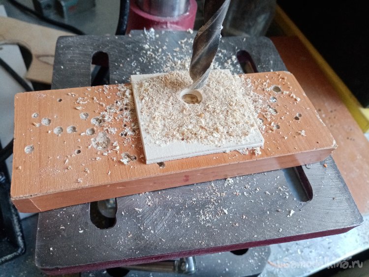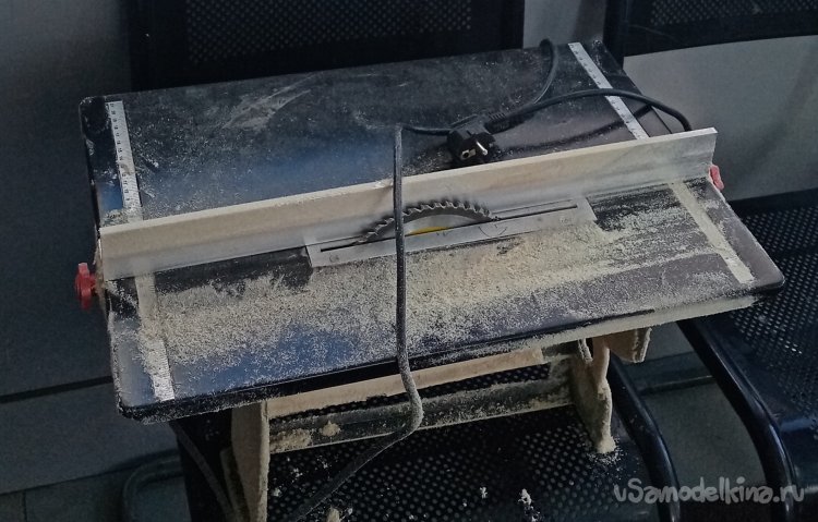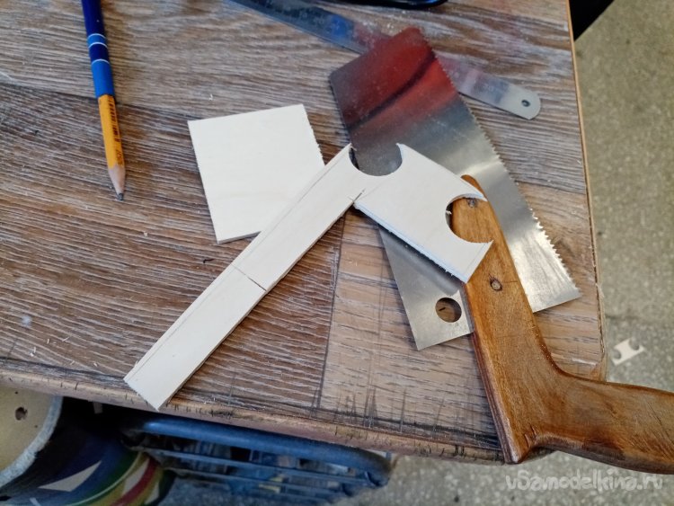 В данном случае я угадал. Наклеиваю пластину с запасом, чтобы не маяться с подгонкой детали. И оставляю окончательно высыхать на батарее. После обрежу по контуру нижнюю часть. Пока все клеится, нужно вырезать мотораму. При помощи самодельной пилки с мелким зубом отрезаю нужный размер из ненужного кусочка 4 мм шлифованной фанеры.