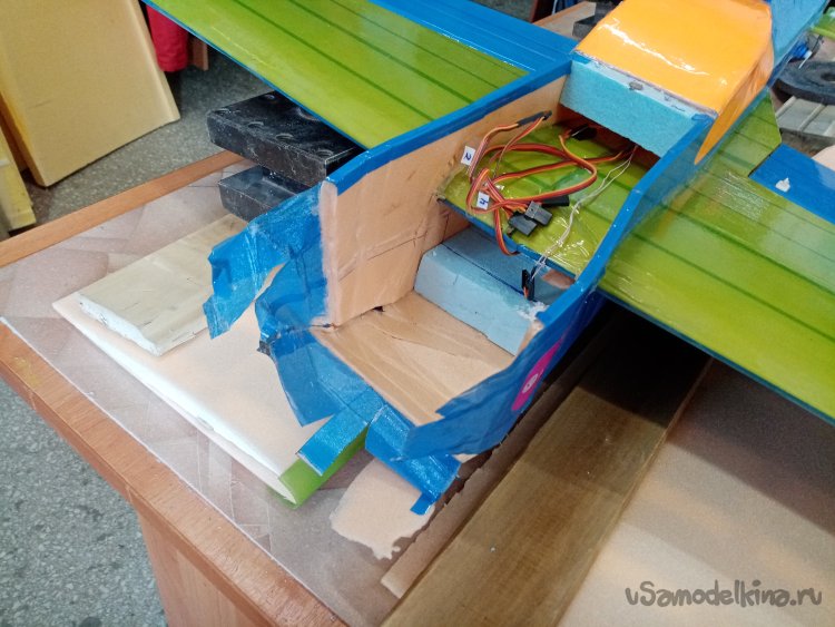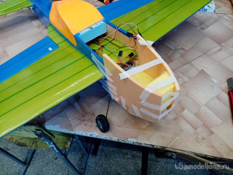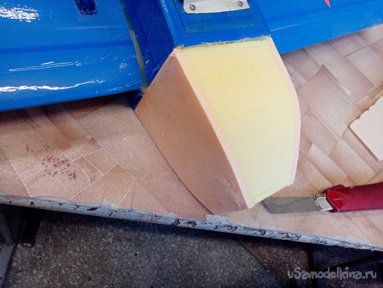 Проект мне давно знаком и не понравился носик. Уж больно широк в плане, значительно закрывает винт. Поэтому решил переделать носовую часть в смысле уменьшения поперечного сечения. И так, отрезаю разрушенную носовую часть.
