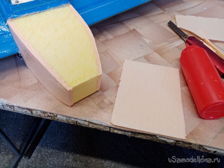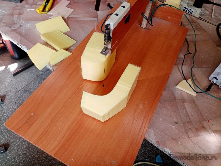 Из толстого утеплителя толщиной в 50 миллиметров вырезаю нижнюю часть носика. На самодельном пенорезе.
