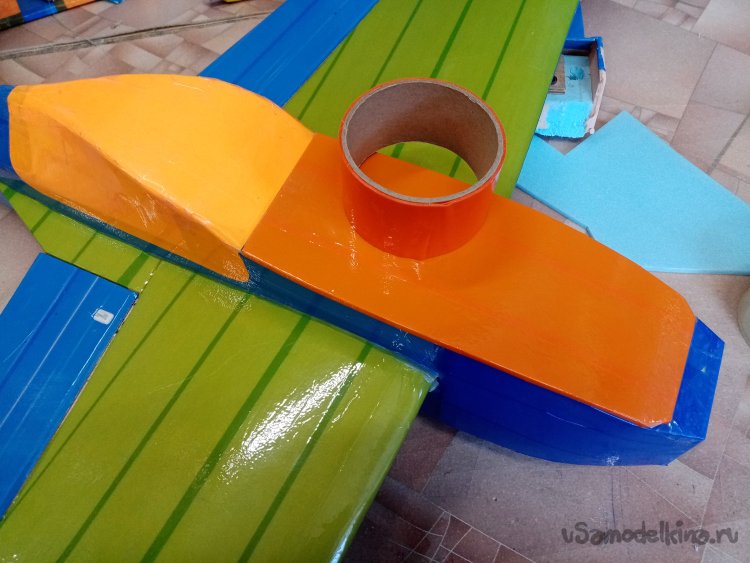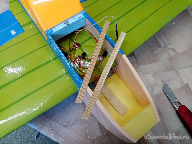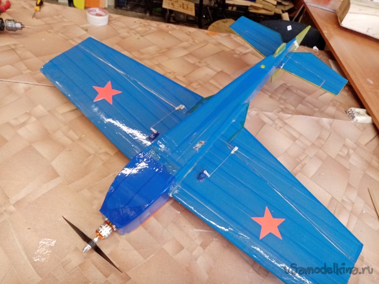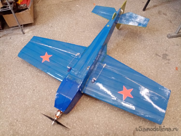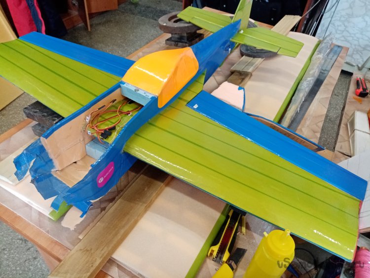Мне многие товарищи дарят совершенно безвозмездно «значит даром» практически целые самолетики. И вот однажды поступил звонок-«Привет, самолет нужен? Слегка помятый». Мой товарищ по борьбе решил сделать подарок. А как-же, никогда не отказывался. Пошел забирать подарок. И что я вижу, прекрасный самолетик проект «катана». Отлично изготовлен. Немного побит носик. Это ерунда конечно, восстановлю. Все сервоприводы установлены. Даже на пузике есть небольшой светодиод. Правда, на фото уже отрезана носовая часть.