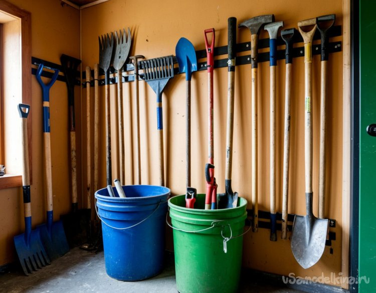 ✔ Настенные крюки и держатели — для лопат, граблей, шлангов.