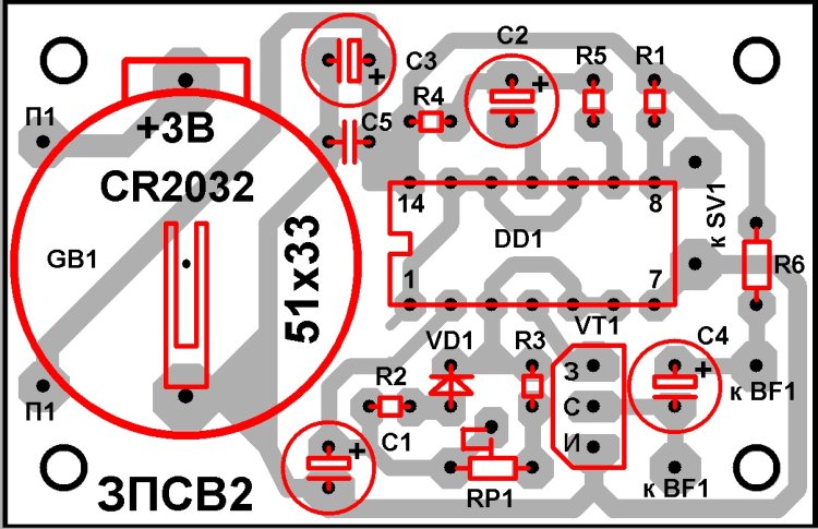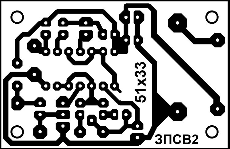 Печатная плата ЗПСВ2 выполнена из односторонне фольгированного стеклотекстолита размерами 51 х 33 х 1,0 мм (см. рисунки 02 и 03). Диаметр отверстий на печатной плате под микросхему - 0,7 мм, под остальные радиоэлектронные компоненты – 0,8 … 1 мм, под соединительные проводники - 1…1,2 мм., под 3 крепёжные отверстия – 3,2 мм. Под правое верхнее крепёжное отверстие, предназначенное для крепления пружины, – 2,5 мм.