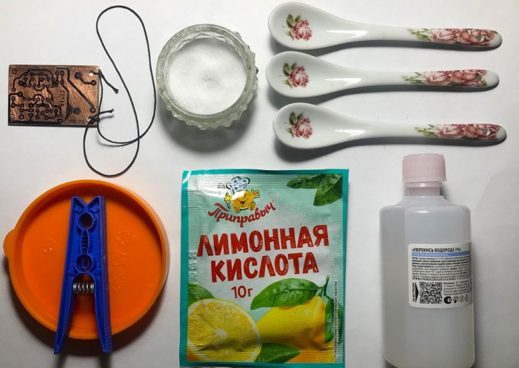 Рецепт для травления ПП. В 100 мл 3-х процентной перекиси водорода (желательно при постоянном перемешивании) растворяются 30 грамм пищевой лимонной кислоты. После растворения, в получившийся раствор можно добавить 1-3 чайные ложки (с горкой) поваренной соли (NaCl). Снова размешать. Таким раствором можно протравить до 50 см2 листового стеклотекстолита. При подогреве раствора время травления уменьшается. Однако, не рекомендуется повышать температуру раствора до «вскипания» (до обильного выделения пузырьков).