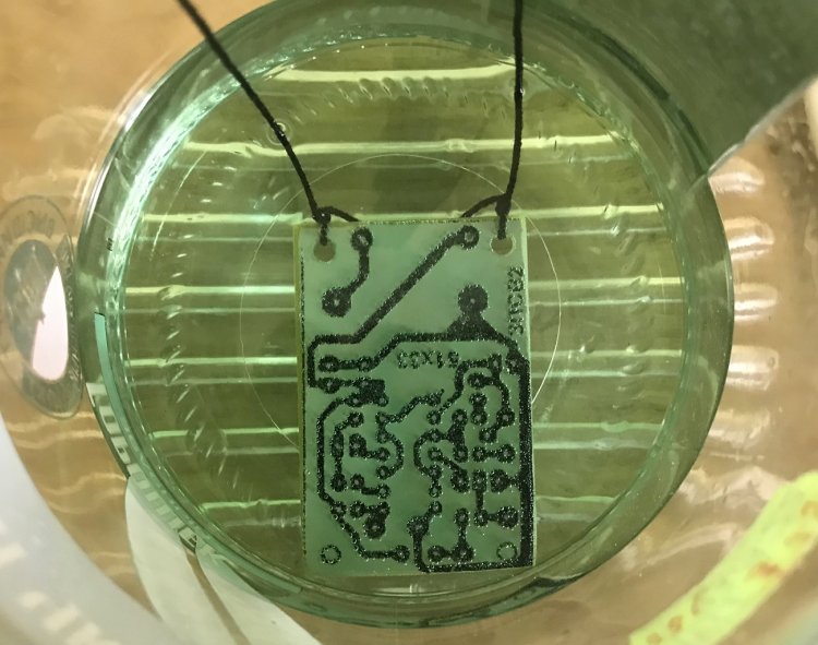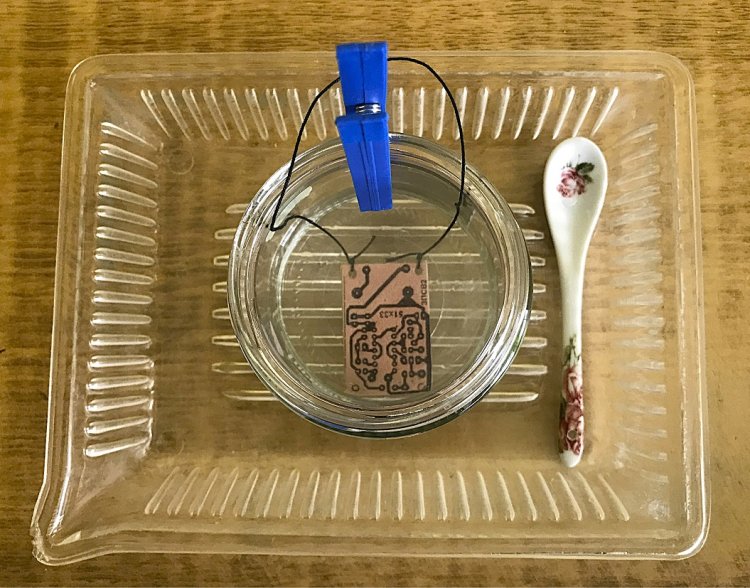 В начале травления раствор почти прозрачен. Синяя бельевая прищепка предотвращает падение суровой нити, привязанной к плате, в травящий раствор.