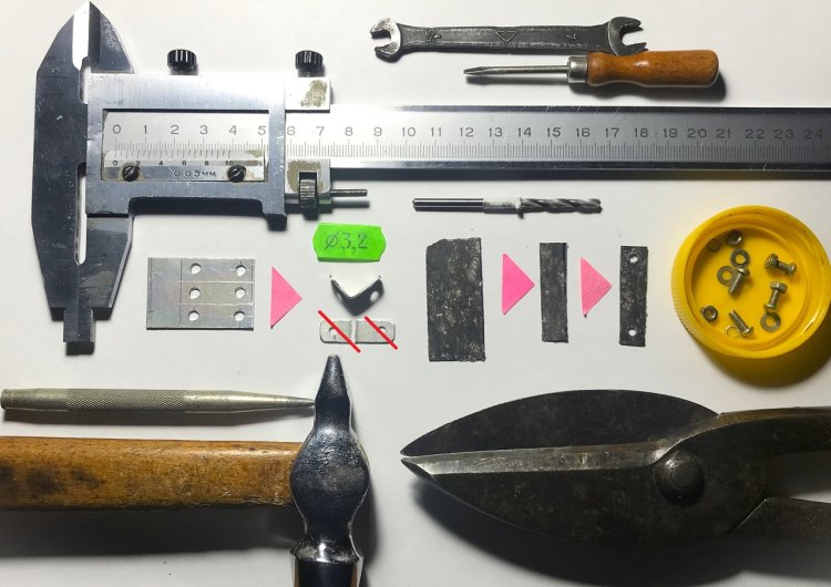 На рисунке 12 показана заготовка для изготовления четырёх крепёжных уголков. Два уголка – резервные. Они предназначаются на случай неаккуратного разламывания при их изгибе под углом 90 градусов. Справа от уголков показана последовательность изготовления паронитовой изолирующей прокладки размером 35 х 10 мм.