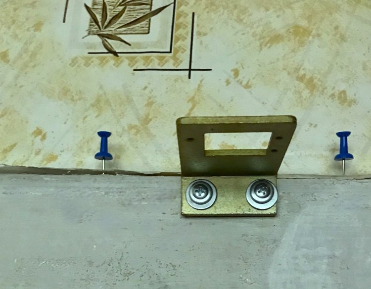 Так выглядит стальной оцинкованный угольник, прикрученный к верхней планке дверного косяка. Синие канцелярские кнопки для ЗПСВ2 не нужны. Ими к планке приколот двухпроводной кабель, ведущий к другой конструкции.