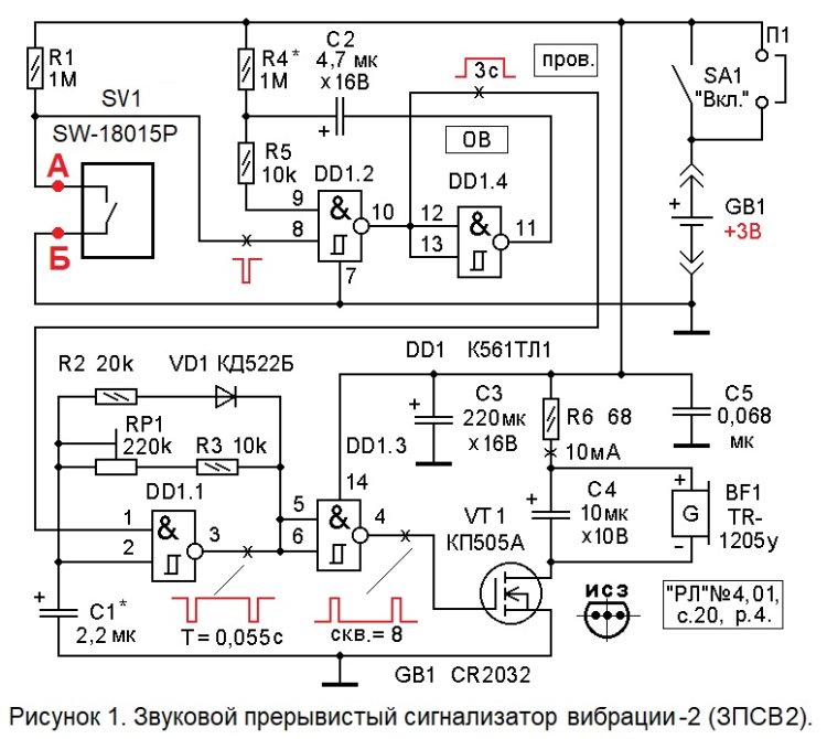 Получена очередная посылка с новыми радиодеталями. И в голове возникла идея изготовить высокоэкономичное, миниатюрное, многофункциональное и одновременно простое устройство - звуковой прерывистый сигнализатор вибрации - 2 (далее просто ЗПСВ2). При составлении схемы приоритет был отдан современным компактным радиодеталям.