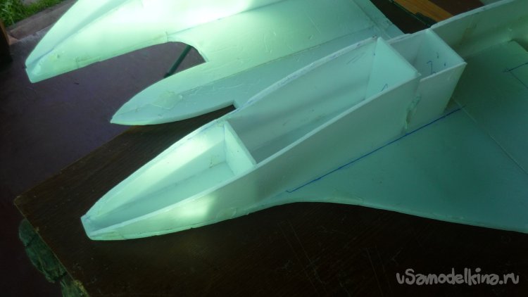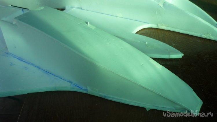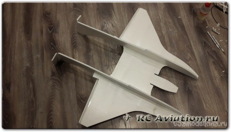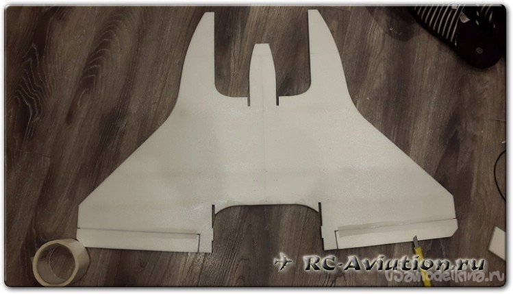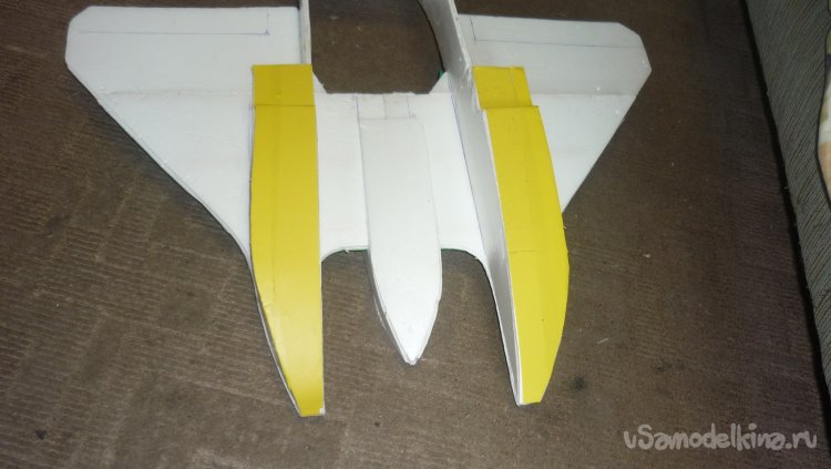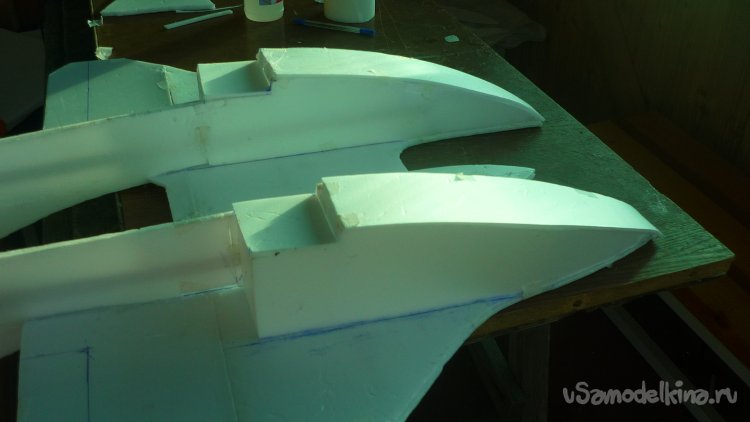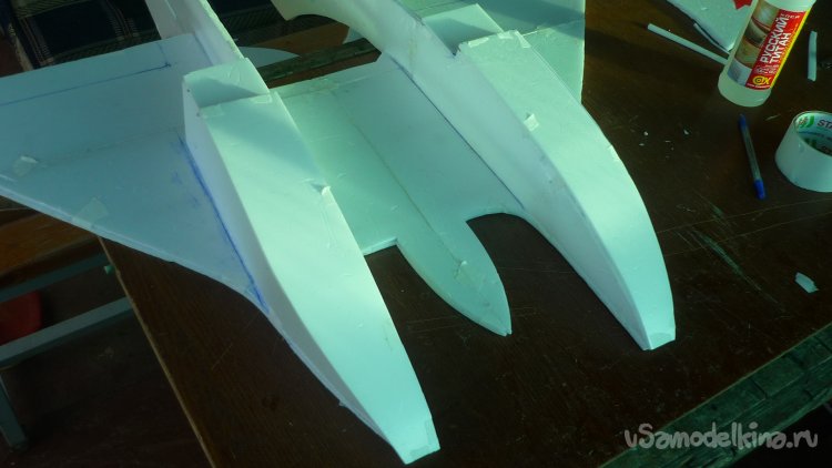 переходящими в кили с рулями направления и между ними монтируется стабилизатор с рулём высоты. Их получилось 4 штуки, потому, как каждая хвостовая балка склеивается в два слоя.