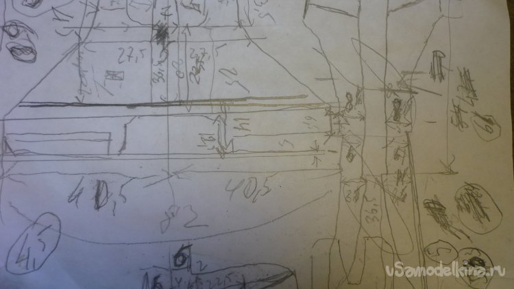 Вот так обшивка выглядит целиком. Разметил размещение деревянныхполосок из ученических линеек на обшивке.