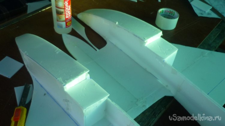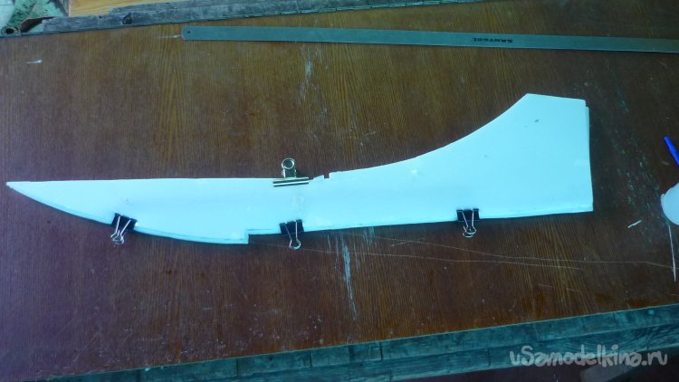 Начинаю раьоты по склеиванию деталей. Вначале скоеил хвостовые балки , вставив внутрь заготовленные полоски от дкревянных, ученических линеек. Кромки зафиксировал скрепками для бумаг.