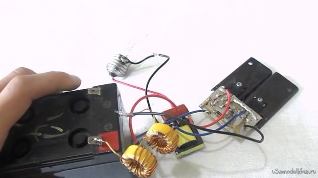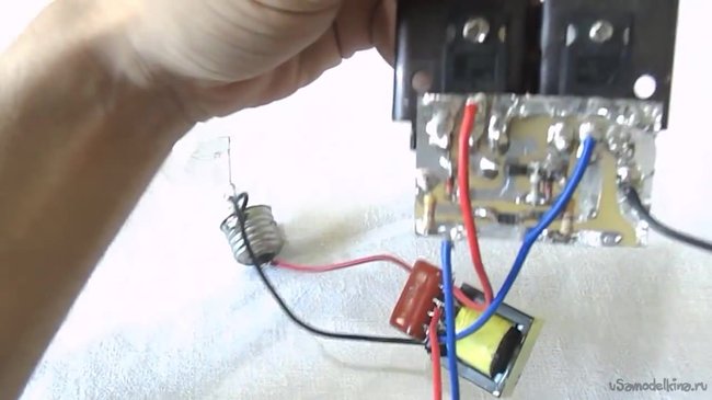 Что касается параметров преобразователя, к сожалению, выходная частота переменная, но вы легко ее можете превратить в постоянный ток, устанавливая на выходе выпрямитель и большой конденсатор с расчетной емкостью где-то 100 микрофарат, при напряжении в 400 вольт. Рабочая частота зависит от лц-контура. В качестве катушки у нас идет первичная обмотка катушки. Установлены 2 дросселя. Обмотка не имеет отвод.
