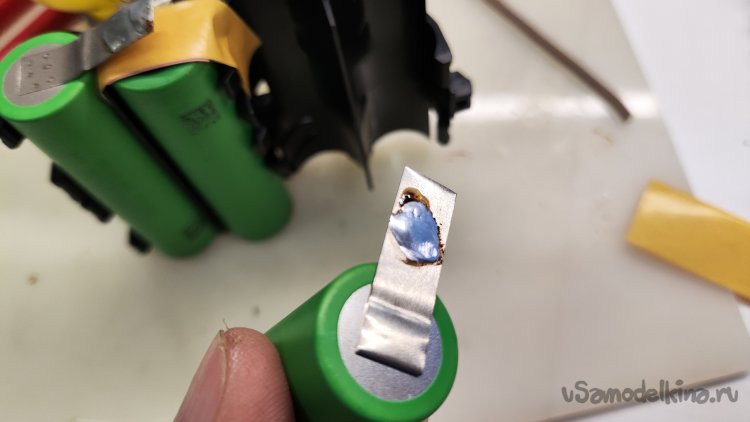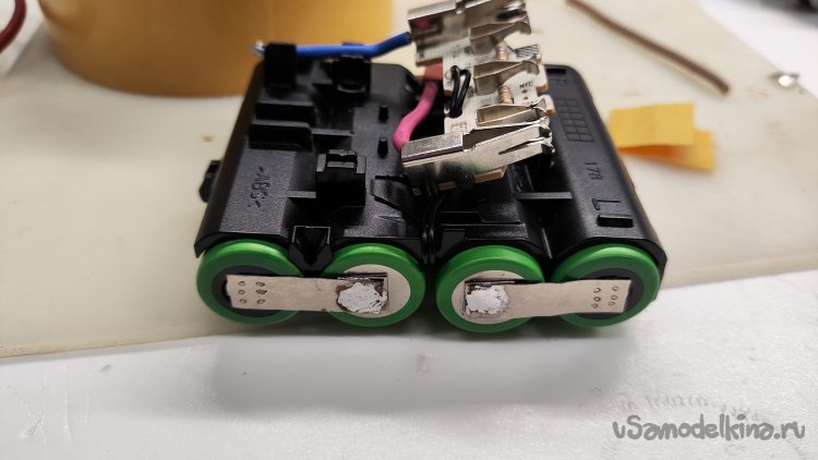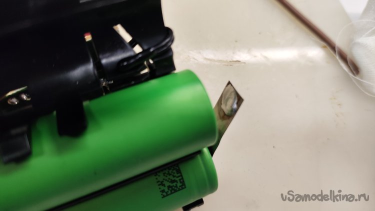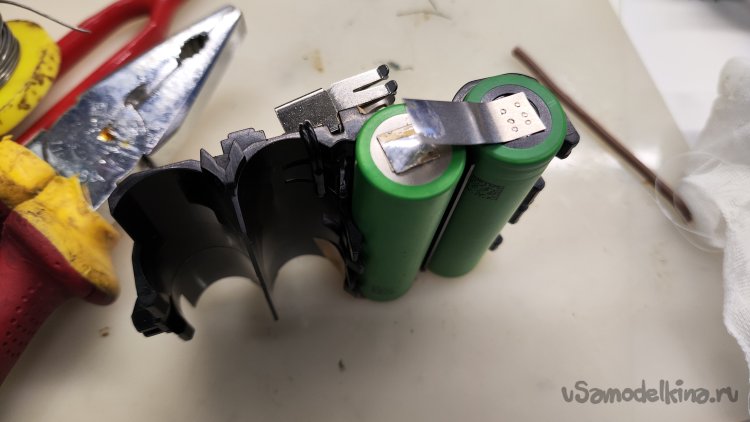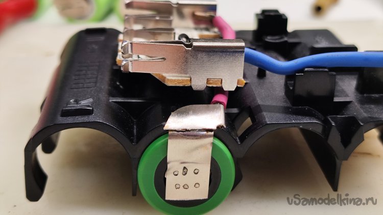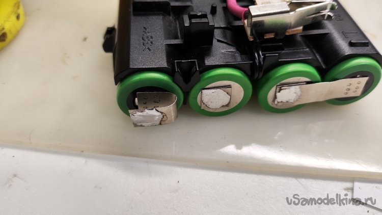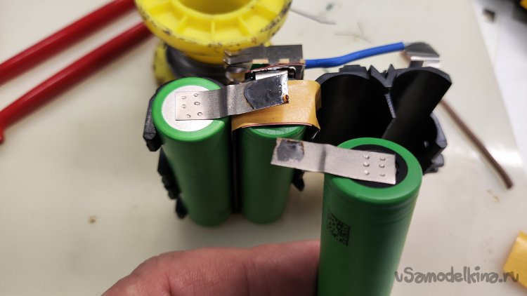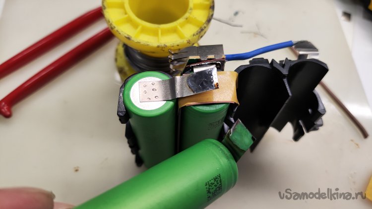 Монтаж новых аккумуляторов начинаю с плюсового вывода, который при последующем монтаже перекрывается соединением двух соседних аккумуляторов. Припаял отрезанный родной вывод к приваренному выводу аккумулятора. Начало положено.