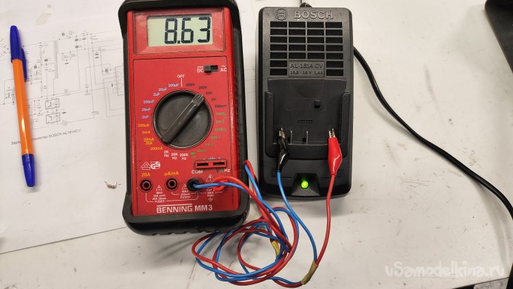 Без аккумулятора зарядное устройство выдает напряжение 8,6 В. Подключение резистора между минусом и ножкой COD ничего не дает, зарядное понимает, что нет термодатчика и аккумулятора.