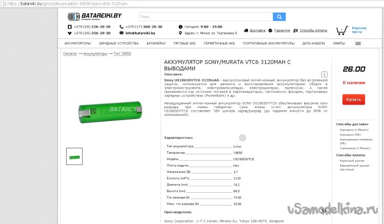 Посмотрел спецификацию родных аккумуляторов Samsung SDIEM INR18650-15Q M. Заявленный максимальный ток разряда 18А. Номинальный ток разряда, я так понимаю, 15А. У новых аккумуляторов Sony максимальный ток разряда 30А, что явно лучше, напряжение будет проседать меньше.