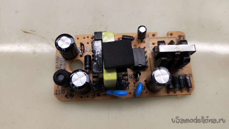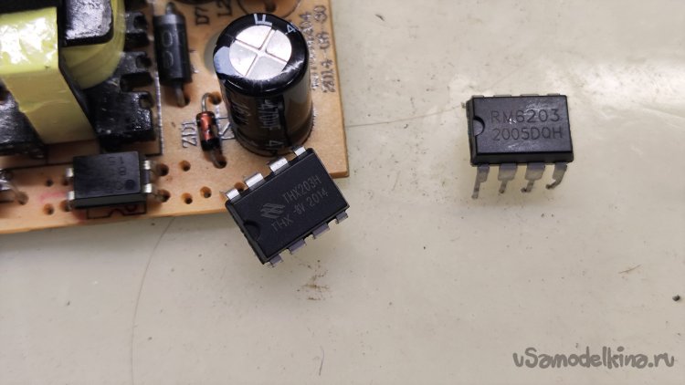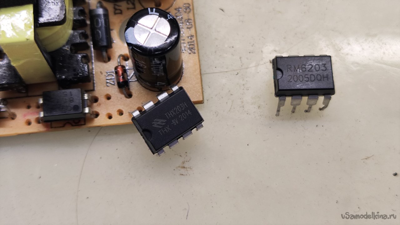 Со вторым блоком питания было непонятно. Следов подгорания нет, предохранитель целый. Диоды все целые, правильно звонятся, короткого замыкания на входе и выходе нет, конденсаторы визуально исправные, оптопара обратной связи исправна. На плате стоит ШИМ-контроллер RM6203. Питание на него приходит, но контроллер не работает.