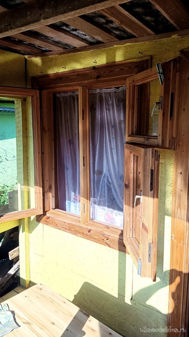 Прикреплять панель к трапу мы решили болтами. В трапе нарезал резьбу, и сверху через заранее просверленные отверстия болтами прикрепил лист к металлу. Из того же материала была сделана ступенька. Из-за своих маленьких размеров ступенька не выгнулась так сильно, как основной лист, и поэтому она была установлена шершавой стороной вверх. Попрыгав по готовому изделию, установили места для подкладки кирпичей. Понятно, что после зимы надо будет что-то подправлять, у нас земля сильно «гуляет» за год. Пока я варил изделие, жена с помощью специально купленного инструмента обновила окошко и дверь бани, и даже покрыла это дело лаком. В общем, получилась красота.