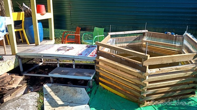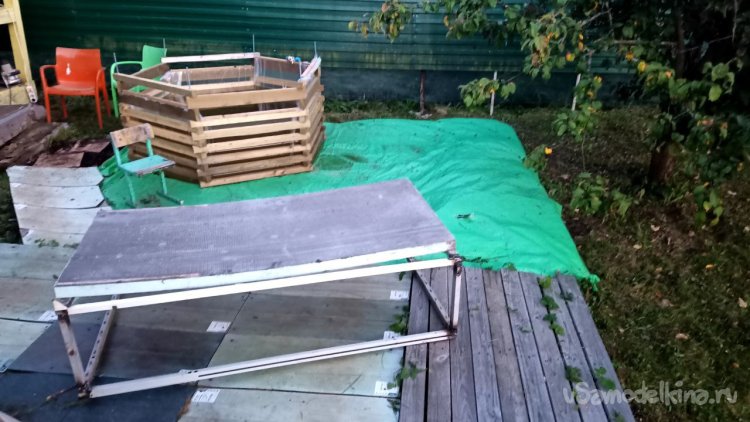 Доброго всем дня, сегодня будем достраивать банно-купальную зону. Раньше я работал в компании СтройМАГ, она занималась напольными покрытиями, и у меня была возможность собирать на даче старые образцы разных напольных покрытий, снятых с производства. Сначала я покрыл всю дачу внутри разными покрытиями, потом место внутри кончилось, и я стал тестировать эти покрытия на открытом воздухе. Очень интересные результаты получались. Например, около купели дорожка покрыта клеевой кварц-виниловой плиткой. Лесенка в баню была покрыта пробковыми полами. Холл в доме сделан из керамогранита, а пол в комнате отдыха в бане из ламината Квик Степ (Quick Step). Этот факт может показаться странным, но, зная исключительную водостойкость этого ламината, мы рискнули попробовать. И вот уже 10 лет он успешно живёт в бане. Конечно, эти покрытия не предназначены для улицы, но тем интереснее их испытать. Когда был жив дедушка, грядки он строил тоже из остатков ламината и замкового кварцвинила. Кварцвинил, оно же ПВХ плитка, самое современное напольное покрытие, поэтому его ассортимент часто меняют, и старых образцов у нас на даче вагон и маленькая тележка даже сейчас осталось. А так как кварцвинил не боится воды, эти образцы лежат круглый год под открытым небом, немного прикрытые баннером. Должен отметить, выдержали все наши морозы и жару.