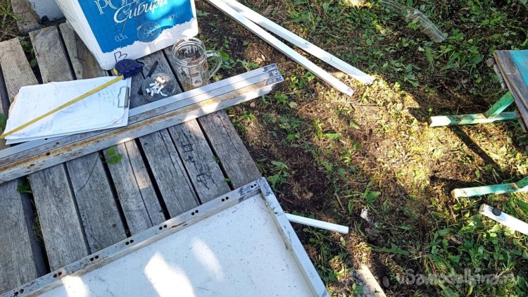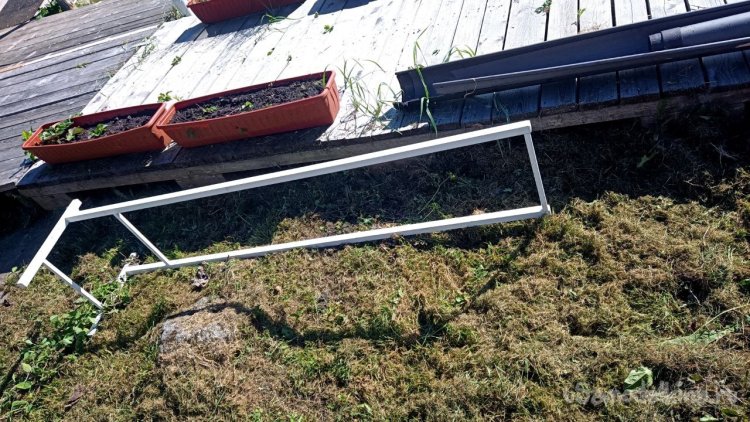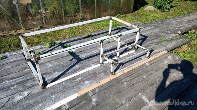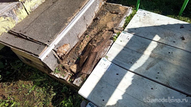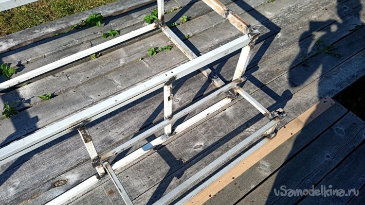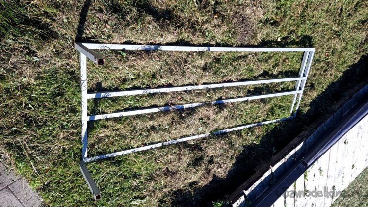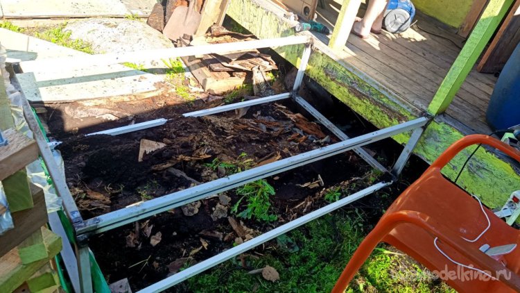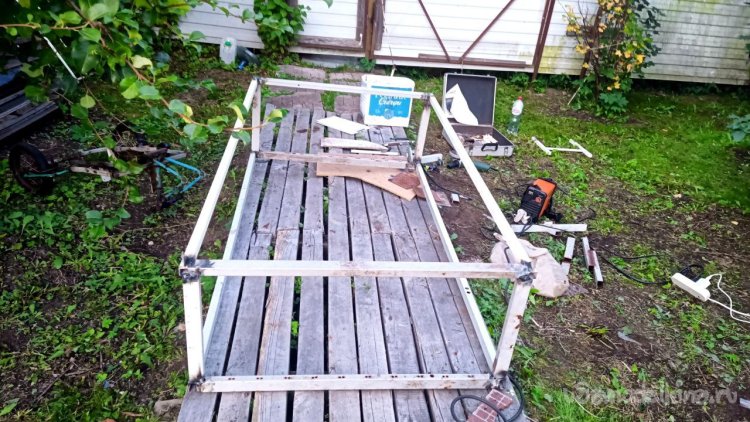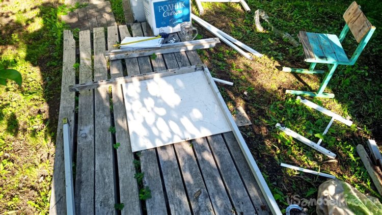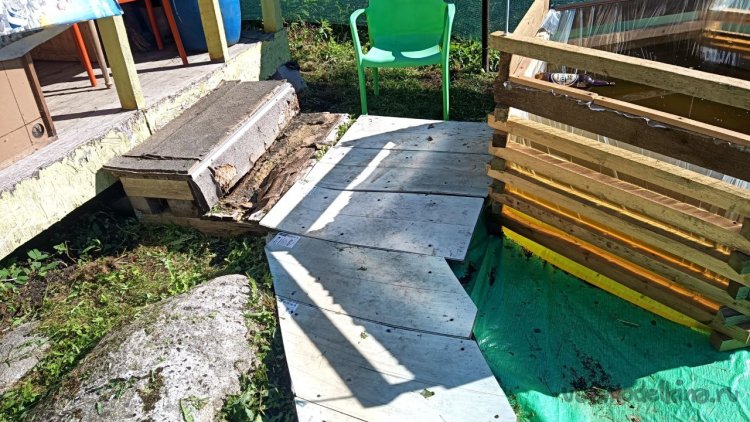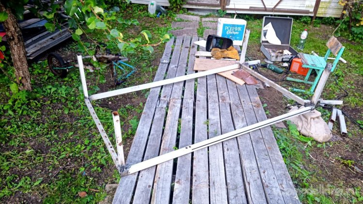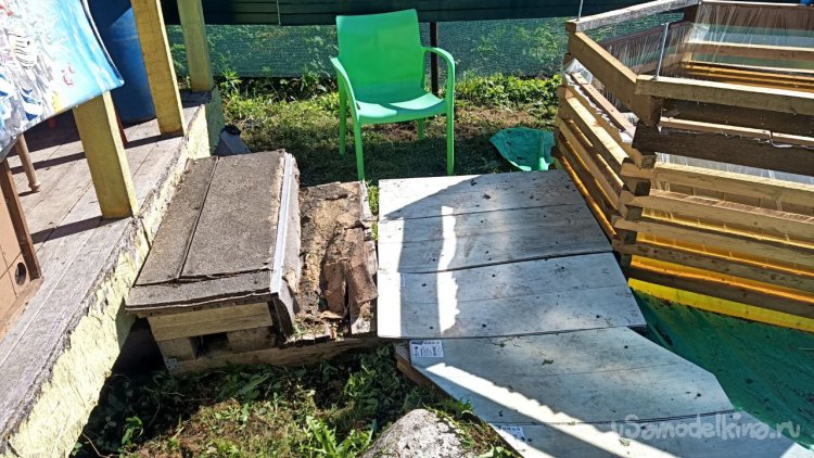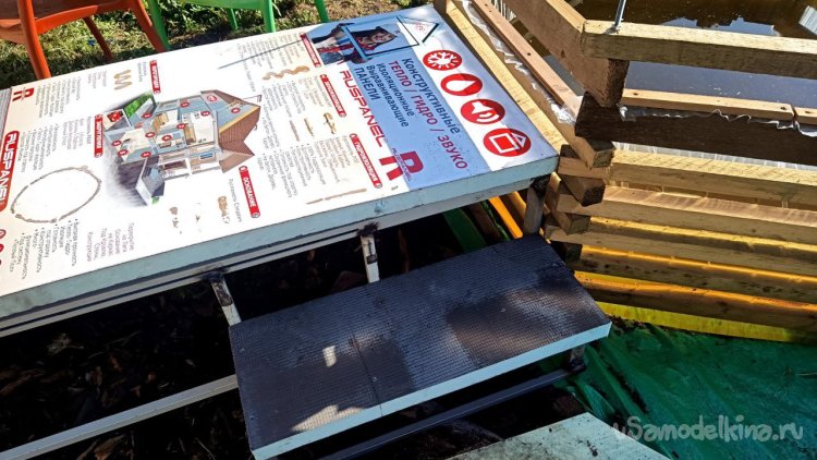 Разбираем старую лестницу от верхнего слоя – пробкового покрытия. Года три оно выстояло, даже больше, чем мы думали. Соответственно названию, сверху у него небольшой слой натуральной пробки. Очень оригинальное и нескользкое, а также тактильно приятное покрытие, по нему приятно ходить босиком. Монтируется как ламинат, но пришёл ему конец. Под ним доски, тоже почти полностью сгнившие. Так и должно было быть, ведь это баня, место повышенной влажности. Берём с женой пиво, и нежно его употребляя, решаем, как сделать что-то новое, красивое, надёжное и недорогое, и чтоб в магазин не ездить. Придумали сварить из металла трап (так мы его назвали) со ступенькой сбоку. Демонтировали и выкинули всё старое, выровняли площадку будущего трапа и сняли размеры. Наперёд скажу, что маленько промахнулись, зазоры оставили маленькие. То, что получилось, теоретически влезало, а практически нет, пришлось разрезать, уменьшать и переваривать. Смысла приводить размеры нет, у каждого свой уникальный. Первый раз в жизни я варил такой большой параллелепипед. По ходу работы сделал несколько сварочных рацпредложений. Например, использовать керамогранит как образец угла 90 градусов и его же подкладывать под место сварки, чтобы не повредить деревянный помост каплями расплавленного металла. Долго думал, какой длины сделать пандус снизу вверх (первоначально была такая идея), потом понял, что лучше сделать просто ступеньку из того же металла. Выставочных стендов за многие годы скопилось много, разных калибров, так что недостатка в металле нет. В качестве верхнего пола мы решили использовать руспанель. Несколько лет назад фирма-производитель привезла нам как смежникам образец такой штуки размером 1 метр на 2 вроде, а может, и побольше. Чудо-материал, не помню точно, из чего он сделан, но что-то похожее на очень плотный пенопласт, армированный с одной стороны каким-то пластиком, что-ли. Он бывает разной толщины (нам достался образец толщиной 5 сантиметров) и размеров с очень разными областями применения, от выравнивания основы под финишное напольное покрытие до стен домов. Тепло-гидро-звукоизоляция. Та фирма закрылась, и панель переехала к нам на дачу. Как я её только не тестировал. Она пережила все морозы и жару, само собой дожди. Только немного выгнулась. И в самом начале проекта с трапом верх решено было сделать именно из неё. Опираясь на периметр трапа, без всяких дополнительных усилений, она прекрасно выдержала мои прыжки даже по центру изделия. Изначально был план постелить руспанель армированной стороной вверх, она шершавая, самое то для банной эпопеи, чтобы не поскользнуться, но в таком раскладе её края загибались вверх, как видно на фото, а это потенциальная опасность зацепиться для не слишком трезвых посетителей бани. Так что решили повернуть наоборот, а потом как-нибудь приделаем какой-то нескользящий резиновый коврик.