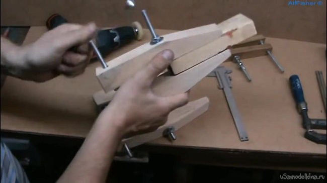 Чтобы бруски струбцины сходились максимально близко, можно к их краям сделать накладки или просто утопить гайки в дерево.