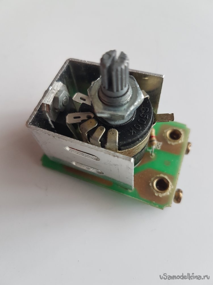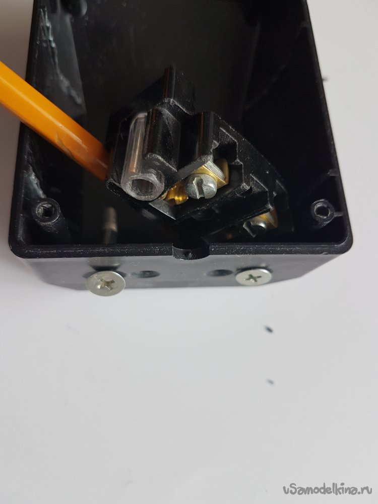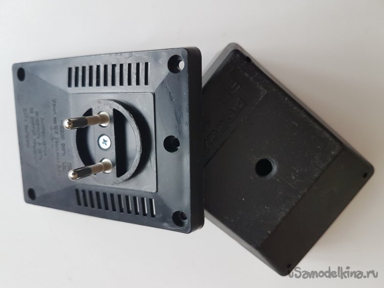 они держат ток 7А и мощность нагрузки -1500 Вт. Для подключения нагрузки взял колодку с контактами от обычной сетевой розетки. Закрепил ее в корпусе при помощи винтов М5 потай, нарезав резьбу на колодке в штатных отверстиях. Для того, чтобы винты крепления проводов не упирались в корпус, поставил на винты М5 пластиковые трубки высотой 18 мм (из корпусов старых шариковых ручек). Саму платку диммера закрепил на корпусе при помощи гайки на потенциометре. Он довольно крепко припаян к плате, не оторвешь.