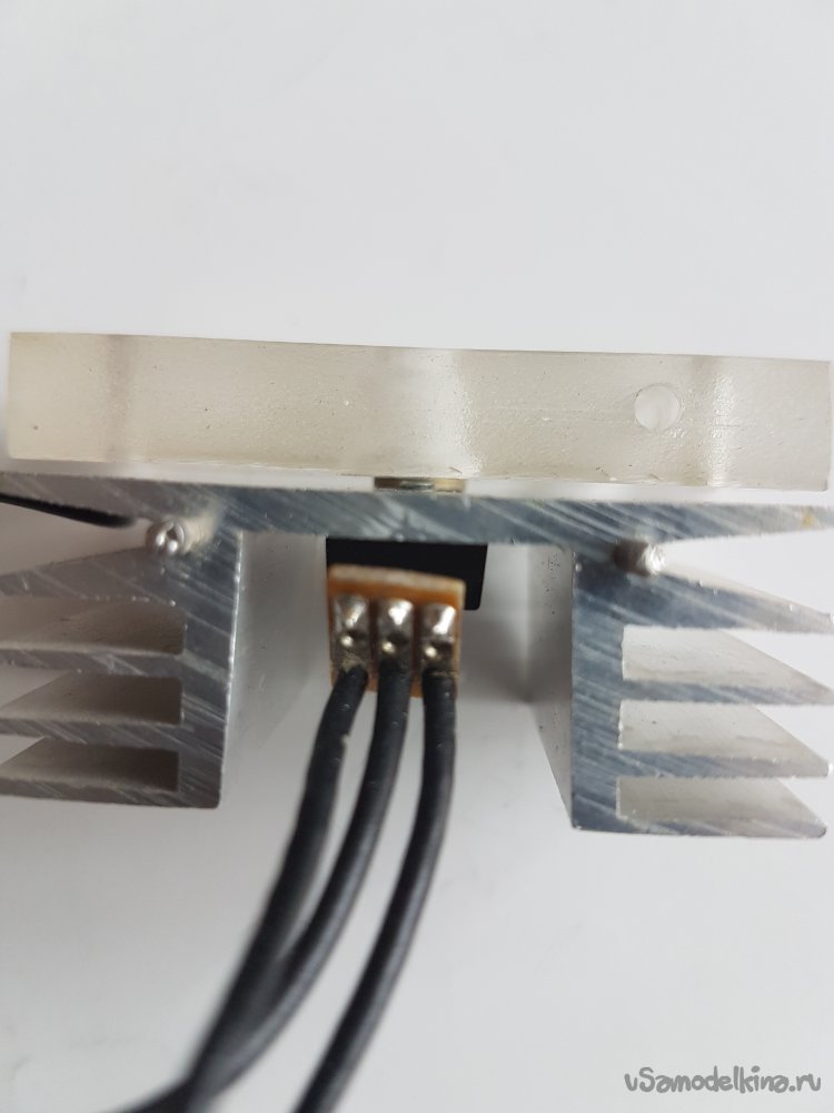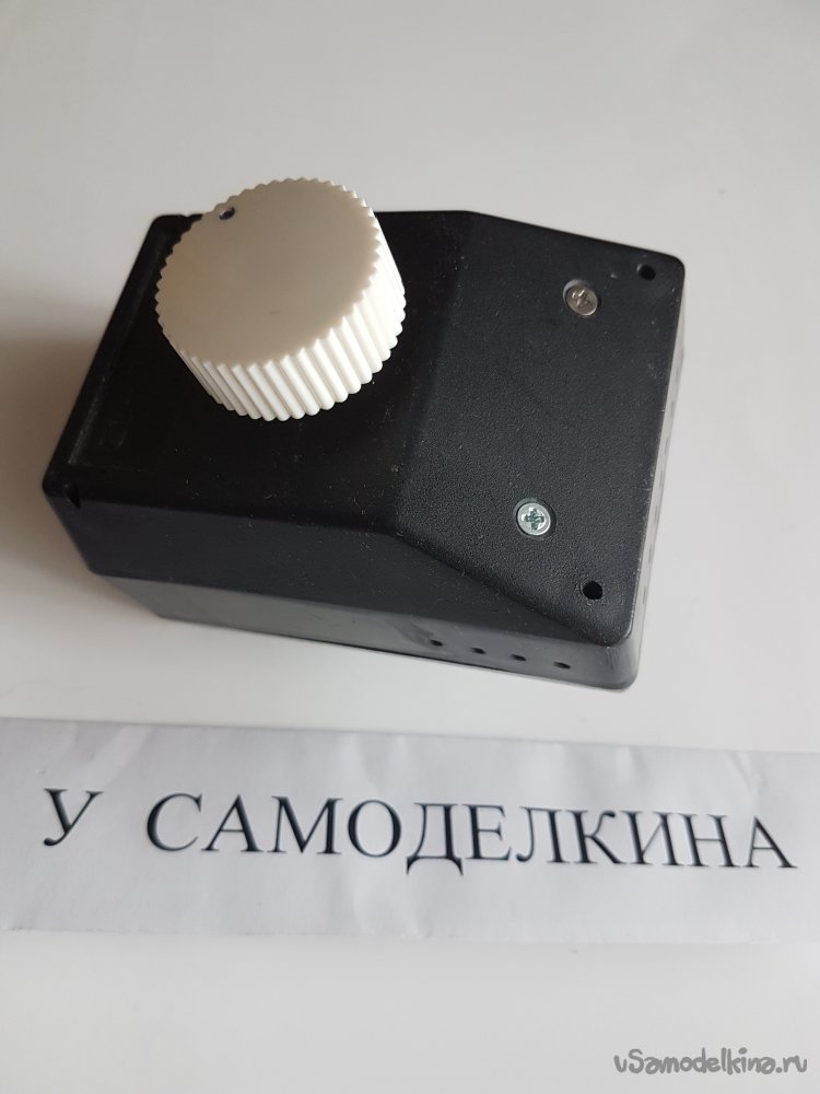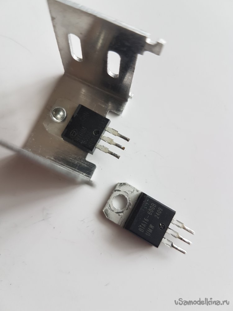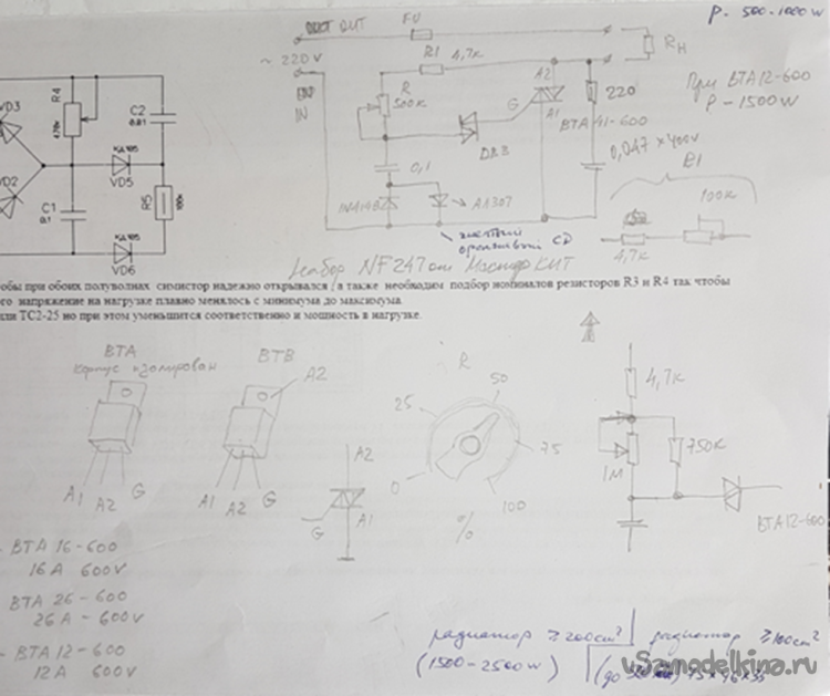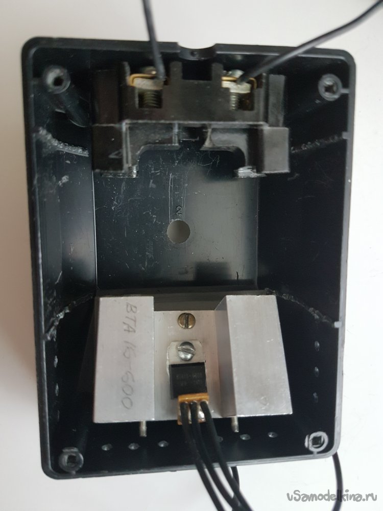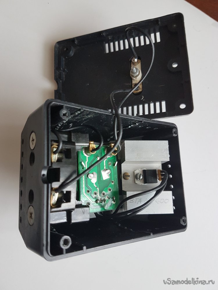 Понадобился в хозяйстве мощный регулятор мощности, так чтобы с нагрузкой ватт 1000- 1500 мог работать. Это с запасом. А так есть старенький ,советский рабочий пылесос «Тайфун», вот и хочу этот регулятор с ним применить. 1980 года выпуска, последние лет 15-20 использую его  в качестве строительного- опилки ,там, убрать или при работе с перфоратором собирать пыль при сверловке. Даже, было, потолки белил при его помощи. Мощность его 600 Вт, коллекторный, вихревого типа. Сосет, только шум стоит. Громкий. Вот и хочу при некоторых работах уменьшить его шумность, снизив обороты движка. Запаса мощности у него хватает. Самому делать регулятор с нуля как то лениво что ли, а тут , как раз валялся и ждал своего часа диммер для осветительных ламп. Неисправный. Знакомый отдал, себе новый взял. Разобрал, посмотрел, не горелый (там и гореть то нечему), но симистору пришел полярный зверек. Что он к нему подключал неизвестно, но загубить симистор ВТВ04-600, рассчитанный на ток 4А, надо постараться. Видимо в параллель к шести рожковой люстре подключал электрокипятильник на 1000 Вт. Ну это его проблемы. Вот и решил взять за основу этот диммер, вернее его кишочки. Все эти регуляторы, в принципе, изготавливаются по одной схеме. Здесь используется принцип фазового управления симистором. Т.е. на основе изменения момента включения симистора VS2 относительно перехода сетевого напряжения через ноль. Конденсатор С1 заряжается через резисторы R1 и R2 до тех пор, пока напряжение на нем не достигнет порога пробоя динистора VS1 - около 32 В. Откроется динистор, откроется и симистор. Через нагрузку потечет ток, определяемый суммарным сопротивлением открытого симистора и нагрузки. Резистором R2 устанавливается напряжение открывания пары динистор- симистор, т.е. происходит регулировка мощности. И, в общем то, при замене симистора можно регулировать работу более мощной (напр. 2500 Вт) нагрузкой. Надо лишь выбрать нужный симистор и обеспечить его нормальное охлаждение, в данном случае радиатор нужной площади. Вот и здесь. Симистор был закреплен алюминиевой заклепкой на несколько хиловатом радиаторе из полоски алюминия, без теплопроводящей пасты. На корпусе диммера указаны его данные: напряжение 250V~, мощность 25W-400W, выключатель на потенциометре держит 250V~, 800W. Нашел в закромах хороший просторный корпус от блока питания чего то советского не знаю чего- БП 10-12 Россия. Он вставляется прямо в розетку, без лишних проводов. Буду ставить симистор ВТА16-600 на пасту и новый радиатор от какого то телевизора, похоже. Главное, он хорошо улегся по месту. Тут небольшое уточнение- конечно маловат радиатор , да еще в закрытом объеме, симистор может греться, и не хило, при работе на максимуме, да ведь и я не буду сутками держать диммер под нагрузкой. Ну тут немного перебдел- закрепил радиатор на куске оргстекла 8х25х55 винтом М3, подложив шайбу около 1 мм между ними, чтобы образовался небольшой зазор. Саму подложку (оргстекло) закрепил непосредственно на крышку БП винтами. Почему так? Так я выиграл место для платы диммера, радиатор сместился немного вверх и полностью изолирован от случайного прикосновения. Здесь дело в том, что широкораспространенные симисторы серии ВТ выпускаются в корпусах двух типов: с изолированным корпусом, т.е. вывод А2 (средний) не соединен с подложкой корпуса и его можно монтировать на радиатор без уста