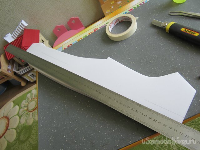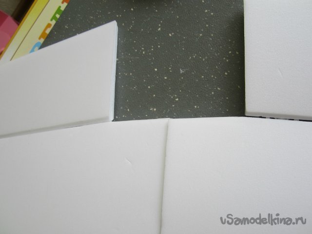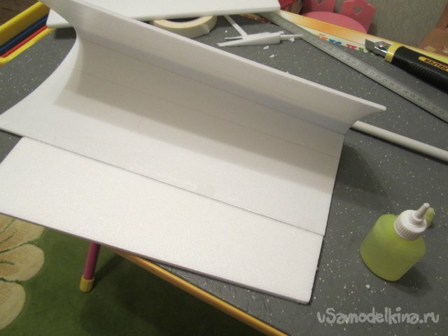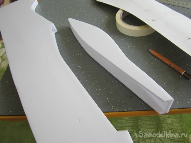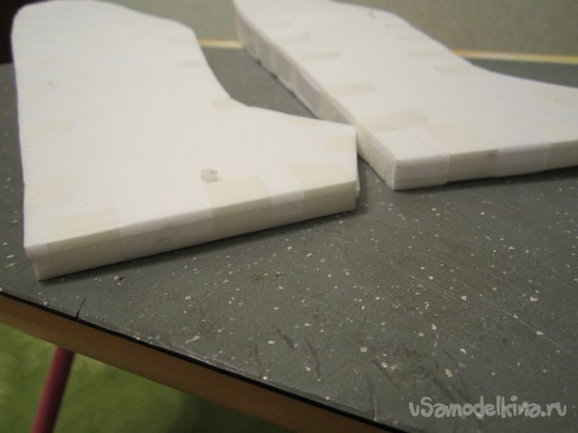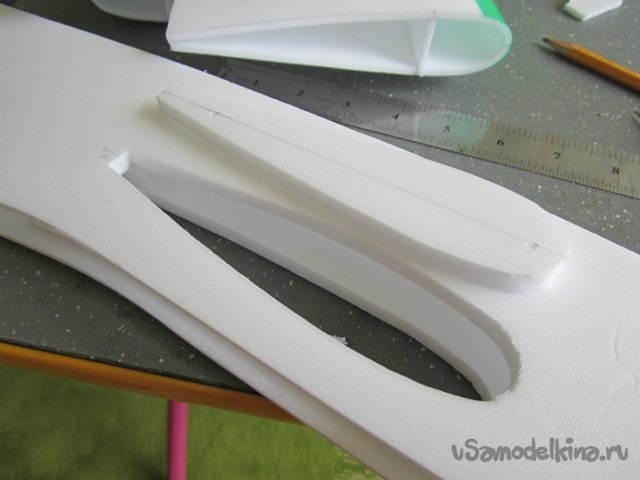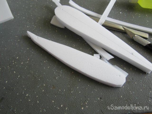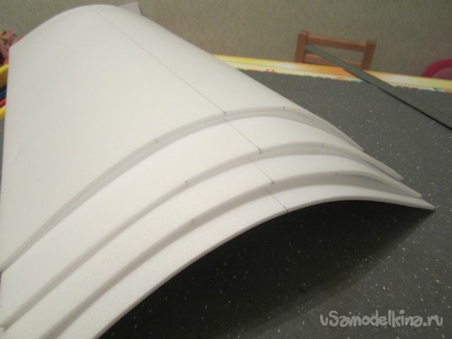 По шаблону вырезаю из потолочной плитки заготовки консолей крыла. Аккуратно изгибаю заготовки о край стола. При таком варианте значительно облегчается склейка консолей. Пенопласт не амортизирует.