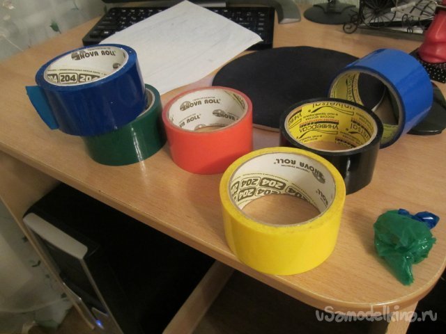 Пока все детали не склеены, можно декорировать самолетик. Буду оклеивать цветным упаковочным скотчем. В собранном состоянии это будет сделать затруднительно.