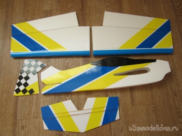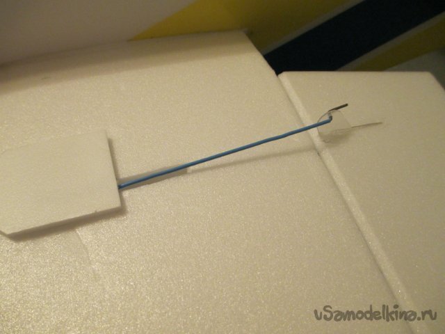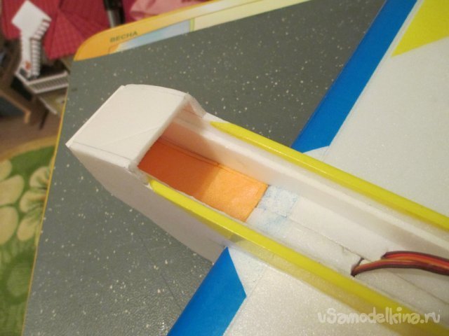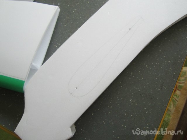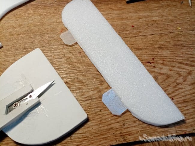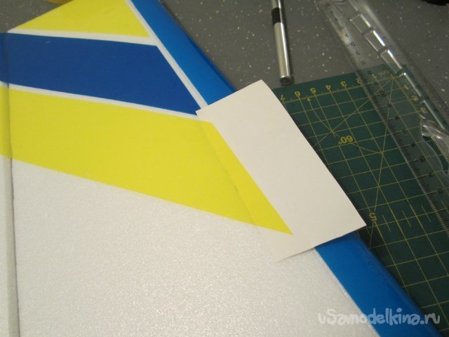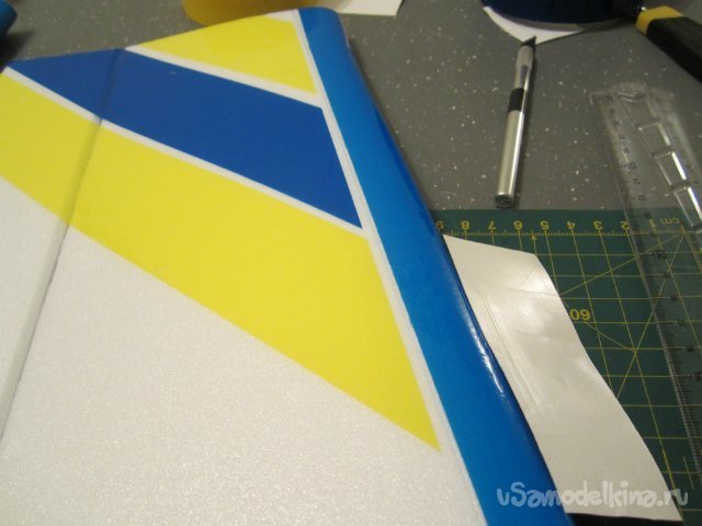 Есть прием, который позволяет резать скотч прямо на крыле, не повреждая пенопласта. Для этой цели под кончик скотча подставляю подложку от рекламной пленки и отрезаю. Затем ненужное удаляется.